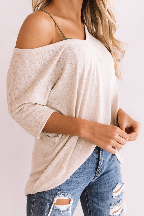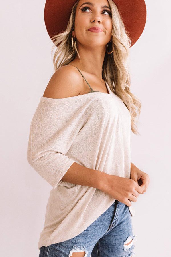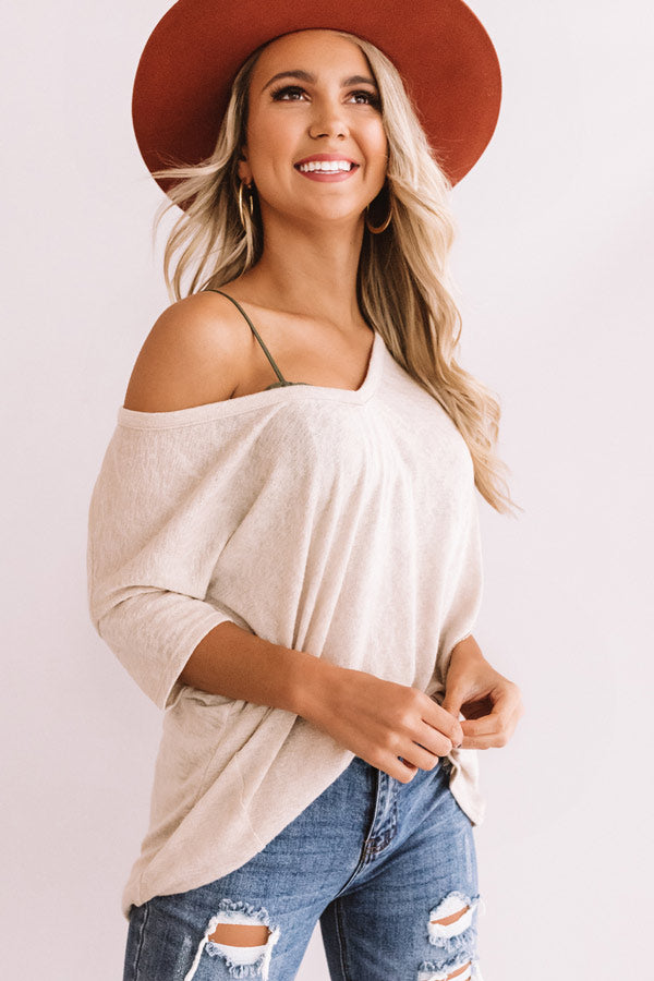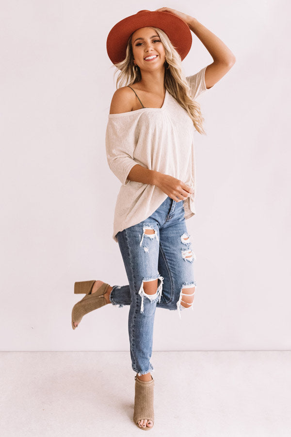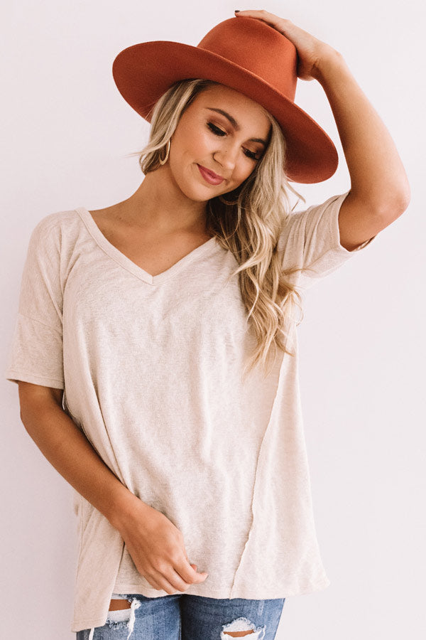You will be anything but basic in the causal iced latte colored "Proud Moments" shift tee featuring lightweight material, a wide v-cut neckline that can be worn off one shoulder, loose short sleeves, exposed raw cut accent seams, and an ultra relaxed silhouette that falls into a rounded hemline! This layering piece can be styled with some distressed ankle skinnies, a colored faux suede hat, and a neutral bootie, or you can wear it under a cardigan or jacket with some flares or a skirt and a neutral wedge and tote! For additional coverage, we recommend wearing with a bralette or camisole underneath to achieve a perfectly layered look. Measurements