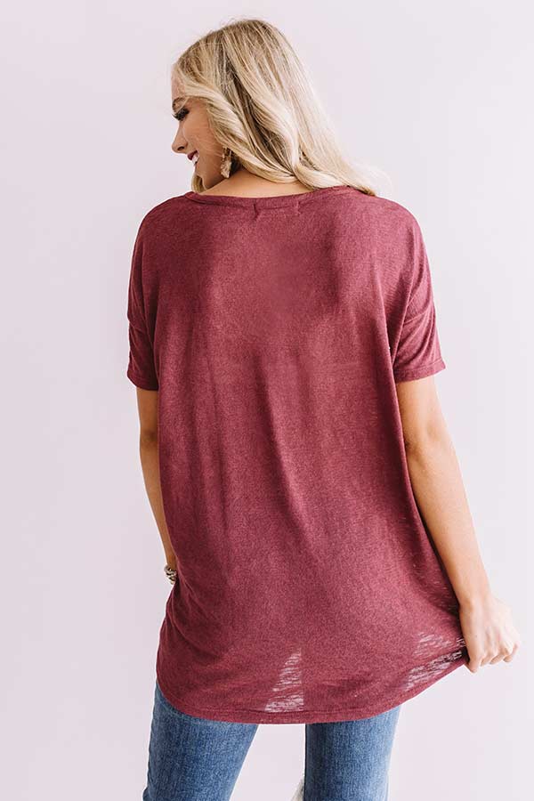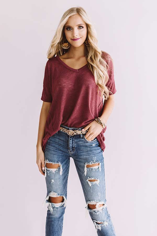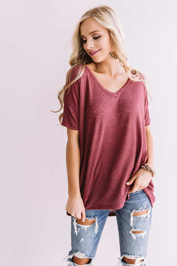 You will be anything but basic in the causal sangria colored "Proud Moments" shift tee featuring lightweight material, a wide v-cut neckline that can be worn off one shoulder, loose short sleeves, exposed raw cut accent seams, and an ultra relaxed silhouette that falls into a rounded hemline! We have styled this transitional basic front tucked into some distressed ankle skinnies and a snake print statement belt and bootie, but you can also wear it under an ivory cardigan with some charcoal flares, "The Jess Faux Leather Heel in Natural," and a grey faux suede hat and tote! Measurements