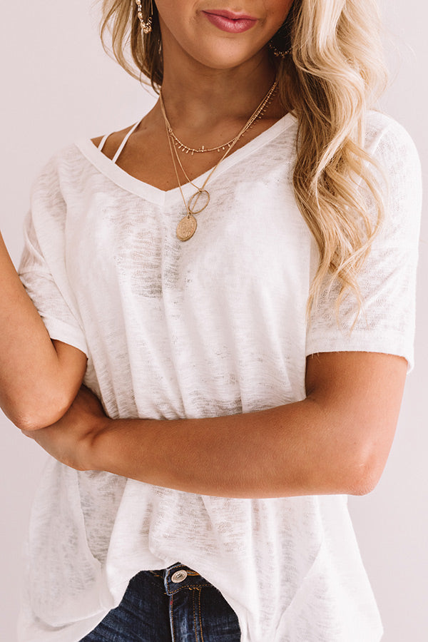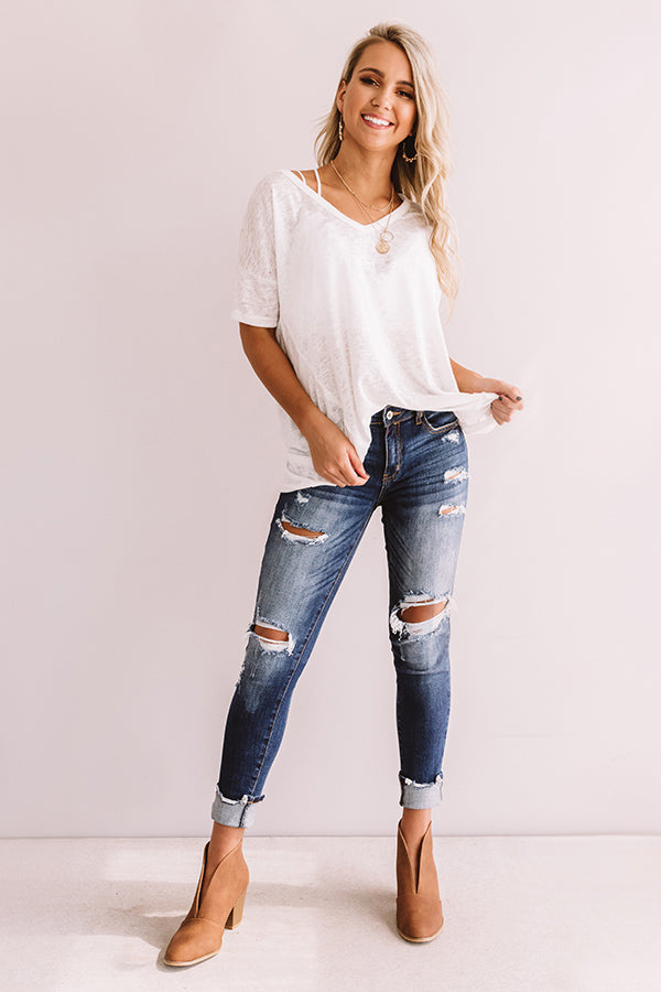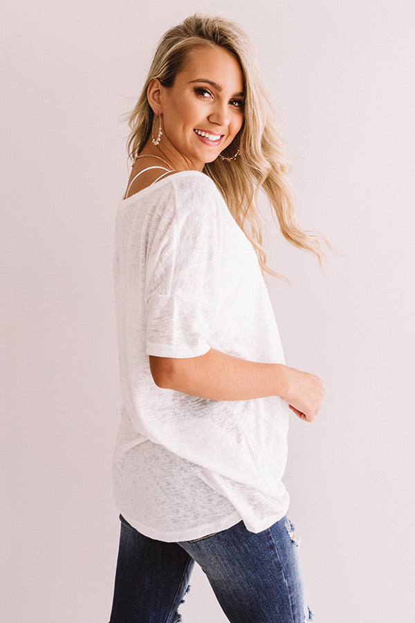 You will be anything but basic in the casual white "Proud Moments" shift tee featuring lightweight material, a wide v-cut neckline that can be worn off one shoulder, loose short sleeves, exposed raw cut accent seams, and an ultra relaxed silhouette that falls into a rounded hemline! We have styled this transitional basic with some distressed ankle skinnies and a neutral bootie, but you can also wear it under a knit cardigan with our "Sweet Victory High Waist Corduroy Skirt in Rust," "The Seraphina Faux Leather Wedge in Brown," and a neutral faux suede hat and tote! Measurements