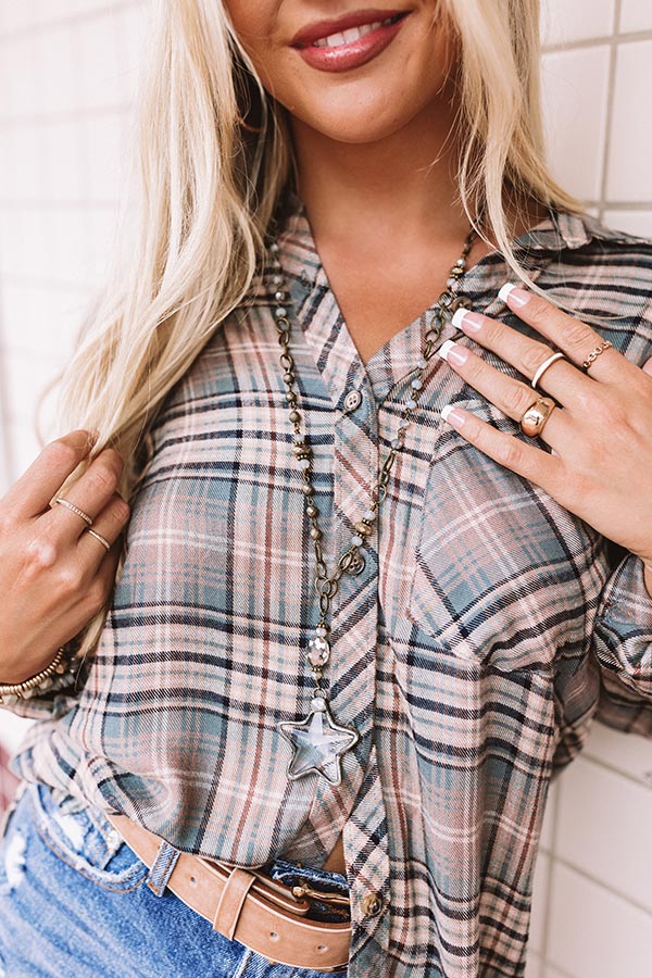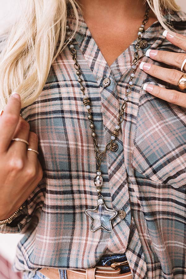 Add a posh flair to any look with this gorgeous necklace featuring a long beaded chain with a large iridescent star pendant!