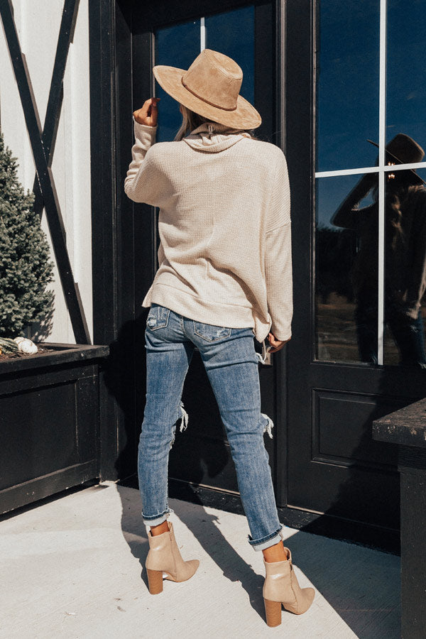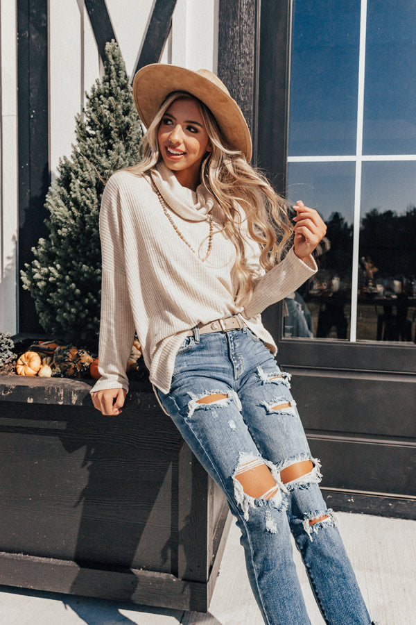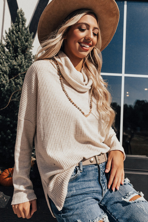 Get prepared for sweater weather with our birch colored "PSL Craving" top featuring soft lightweight tight knit material with ribbed texturing, a high turtle neckline, long loose sleeves, and a relaxed silhouette that falls into a rounded tunic length hemline with side slits! This fall basic can be styled a variety of ways, like front tucked into some distressed skinnies with a neutral bootie and faux suede hat, or with some black flares, "The Seraphina Faux Leather Wedge in Taupe," and "The Lulu Snake Print Headband in Black!" Measurements
