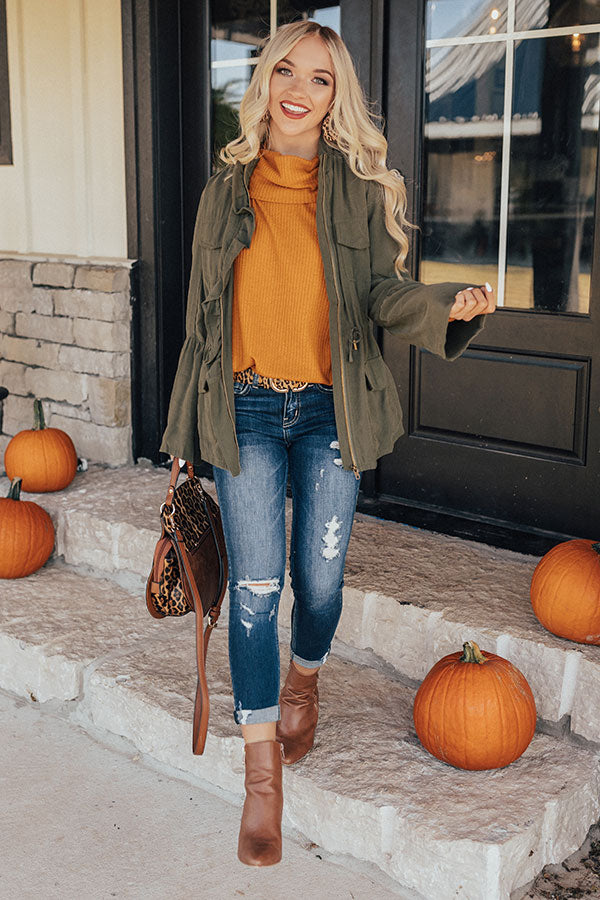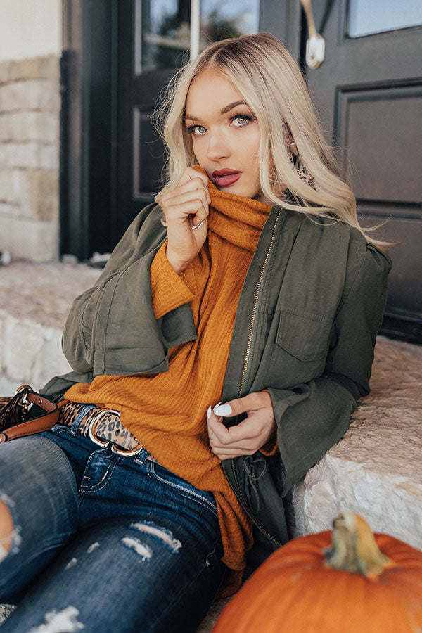 Get prepared for sweater weather with our pumpkin colored "PSL Craving" top featuring soft lightweight tight knit material with ribbed texturing, a high turtle neckline, long loose sleeves, and a relaxed silhouette that falls into a rounded tunic length hemline with side slits! This fall basic can be styled a variety of ways, like layered under a jacket and front tucked into some distressed skinnies with neutral booties and a leopard statement belt and tote, or with some black flares, "The Jess Faux Leather Heel in Natural," and "The Lulu Snake Print Headband in Black!" Measurements