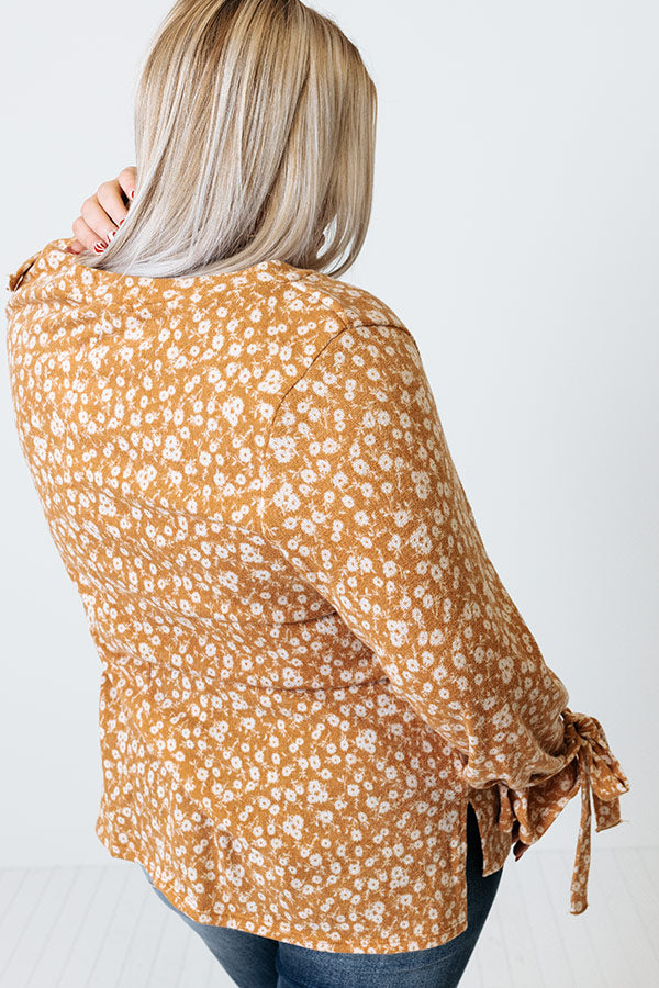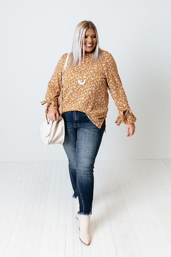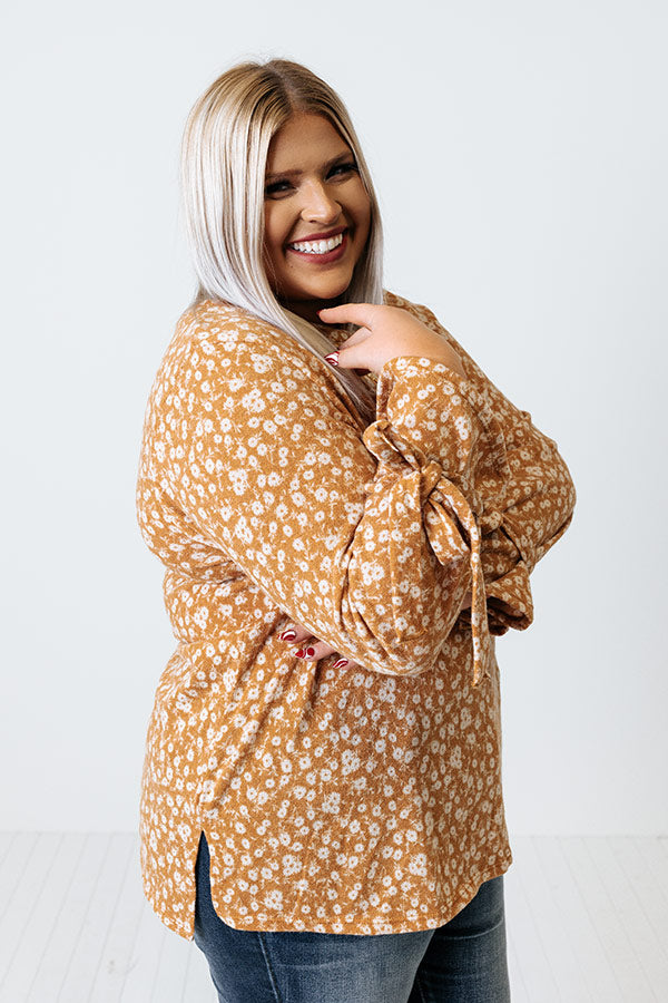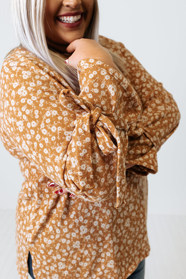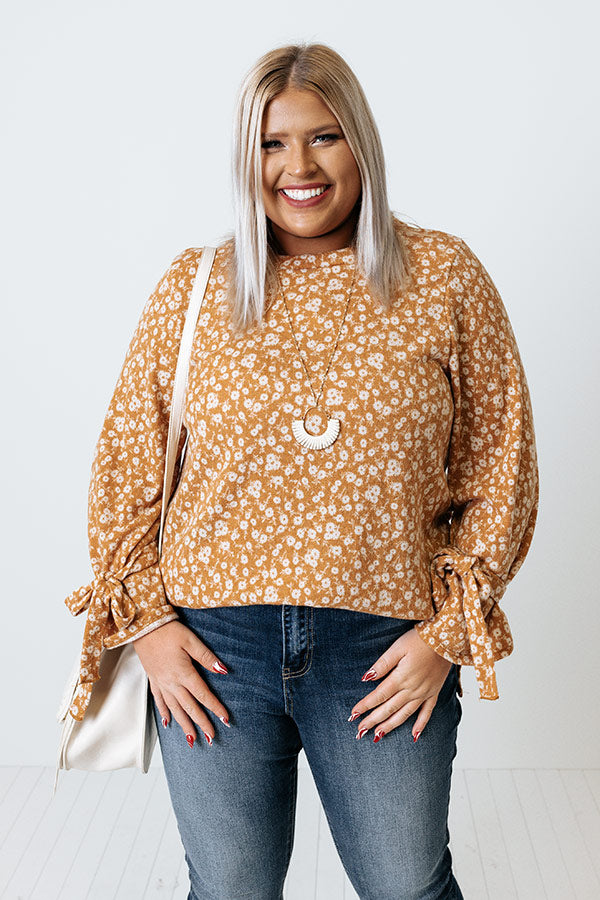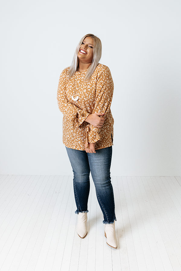 Slay all day in our charming plus size golden honey colored 'Pumpkin Patch Please Shift Top' featuring soft lightweight and warm material patterned with a white floral print, a rounded neckline, long loose sleeves with tie closure accents around the cuffs, and a relaxed silhouette that falls into a straight hemline! Measurements