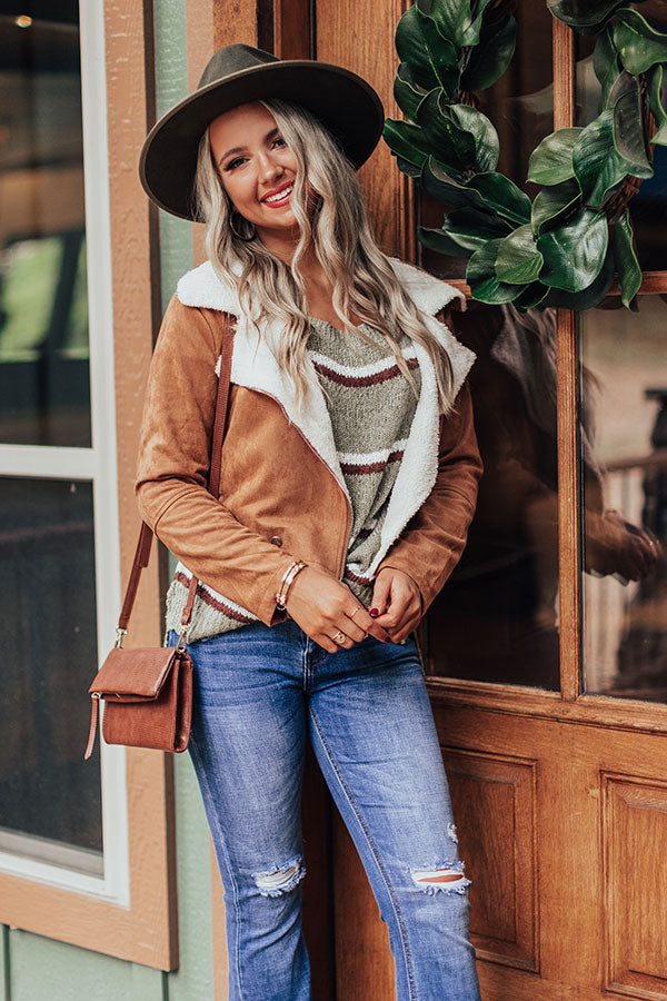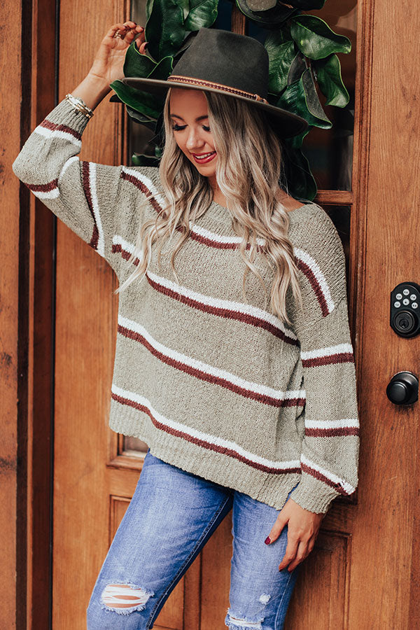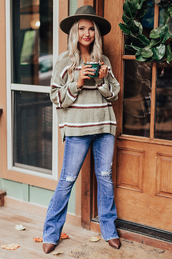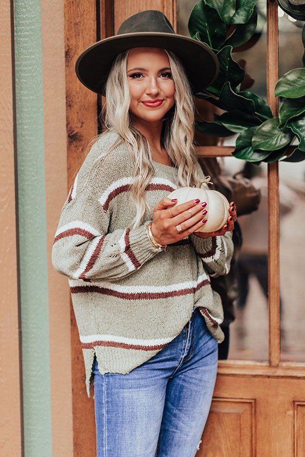 Make the world your runway in our darling sage colored "Pumpkin Spice Delight" sweater featuring soft lightweight loose knit material with horizontal dark and neutral hued accent stripes, a high rounded neckline, long loose sleeves with fitted cuffs, and a slouched silhouette that falls into a straight hemline with accents side slits! Measurements