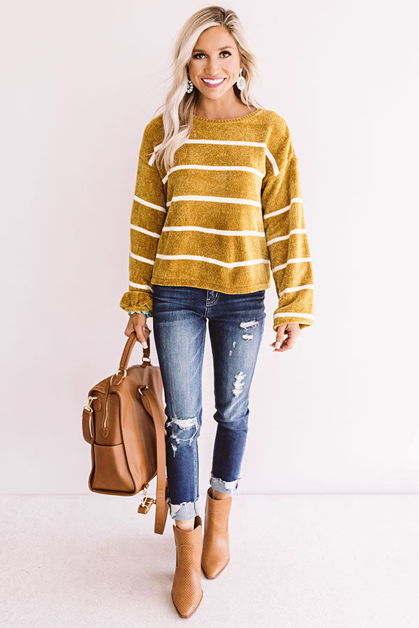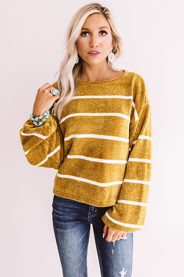 If you just can't wait for fall and "pumpkin spice everything" then this mustard sweater is perfect for you with its ultra soft chenille texture, white striped material, high rounded neckline, long loose sleeves with fitted cuffs, and a relaxed bodice that falls into a straight hemline! We have styled this chic piece with some distressed skinnies, statement earrings, and a neutral pointed top bootie and backpack, but you can also pair it with some white flares, "The Giselle Bow Wedge in Mustard," and our "All Caught Up Headband in Ivory!" Measurements