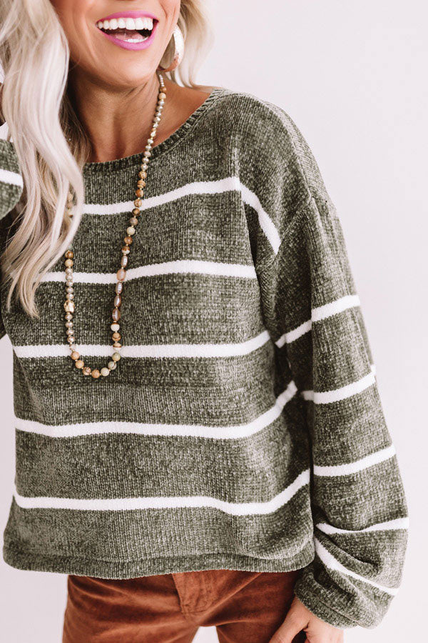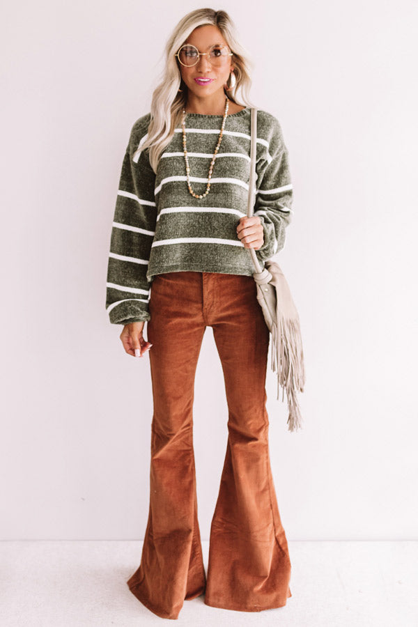 If you just can't wait for fall and "pumpkin spice everything" then this olive sweater is perfect for you with its ultra soft chenille texture, white striped material, high rounded neckline, long loose sleeves with fitted cuffs, and a relaxed bodice that falls into a straight hemline! We have styled this chic piece with some copper corduroy flares, sunnies, statement jewelry, and a neutral fringe crossbody, but you can also pair it with some distressed ankle skinnies, "The Magnolia Espadrille Wedge in Olive," and our "All Caught Up Headband in Ivory!" Measurements