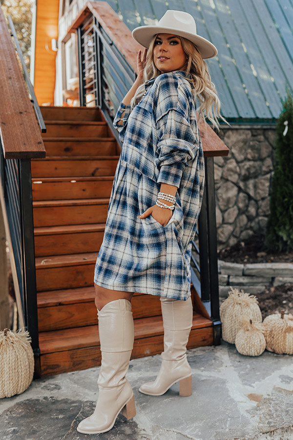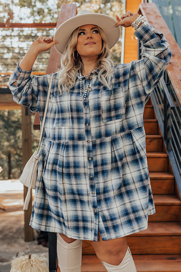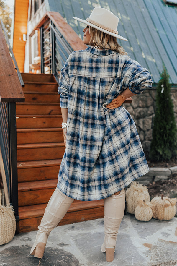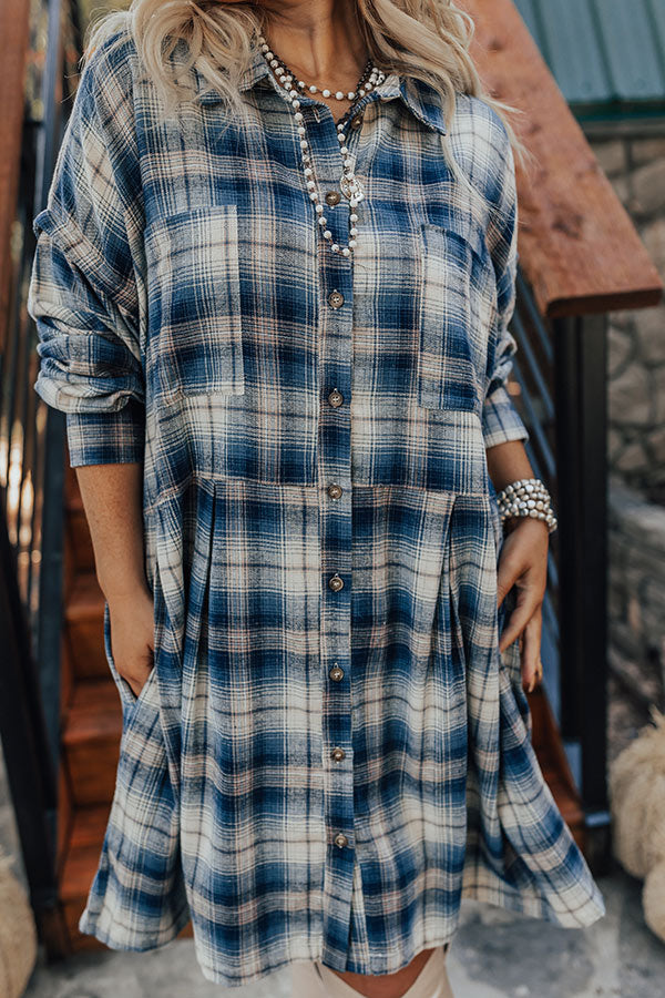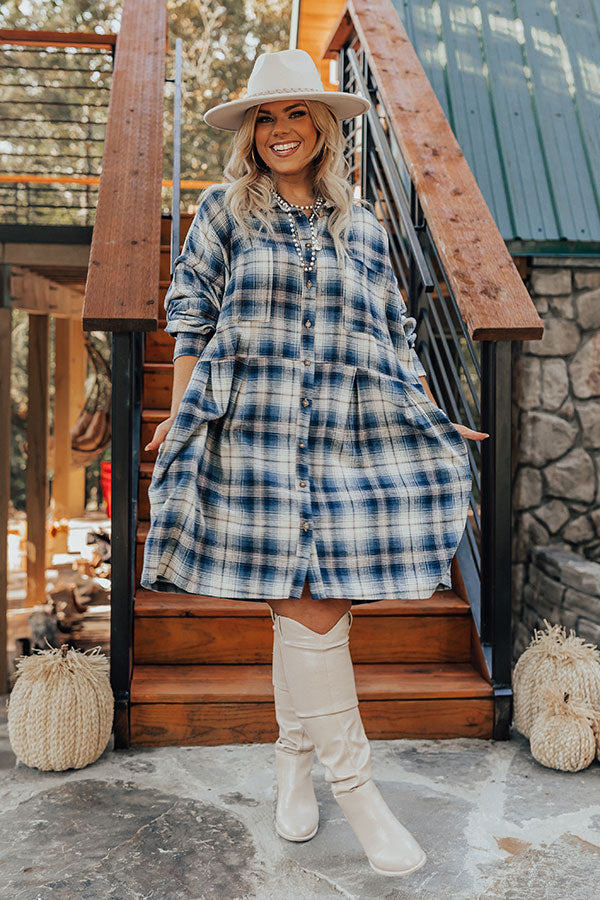 You'll be the pick of the patch in our 'Pumpkin Spice Please' flannel dress! Features soft lightweight blue, natural, and ivory hued plaid print material, collared neckline that goes into button down front, long loose sleeves with button closure cuffs, pleating at the waist, a single chest pocket, additional hidden side pockets, and a relaxed silhouette that falls into a straight mid-thigh length hemline.