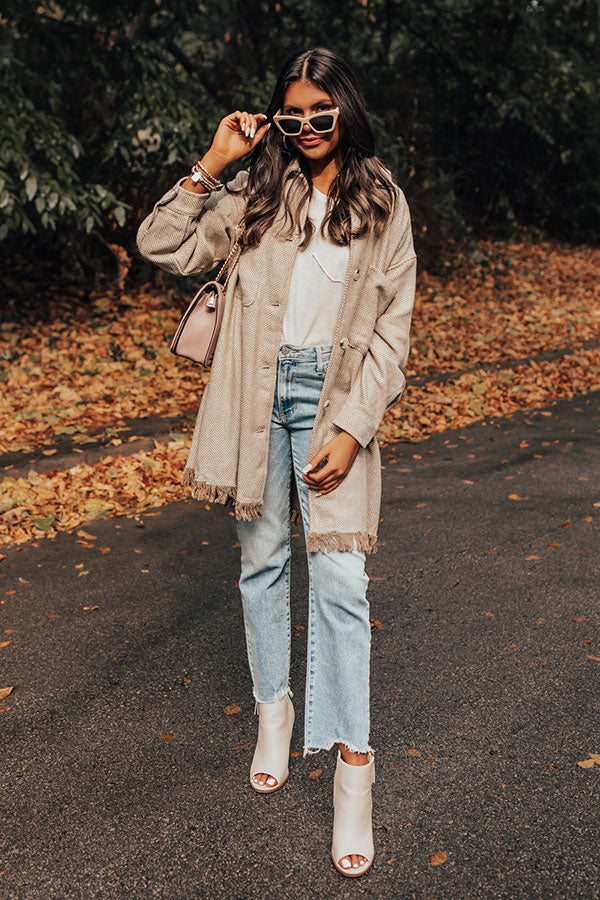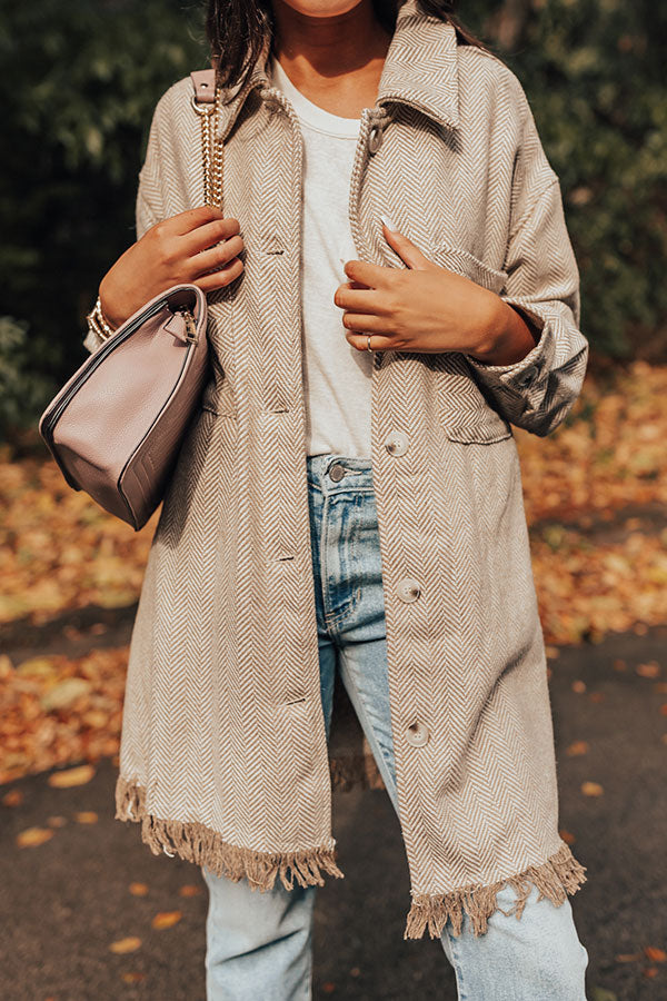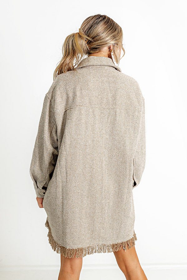 You'll be ready to take on pumpkin spice season in this trendy jacket! Features taupe and ivory colored tweed fabric, collared neckline that goes into a button down front, chest pockets, long loose cuffed sleeves with button closure, and a relaxed silhouette that falls into a straight mid-thigh length hemline with fringe detail.