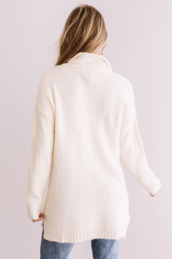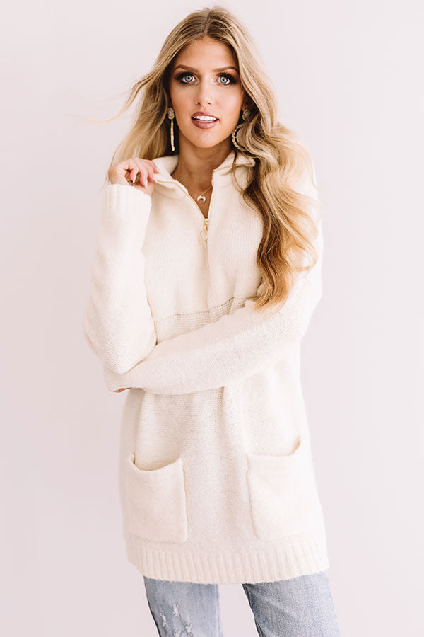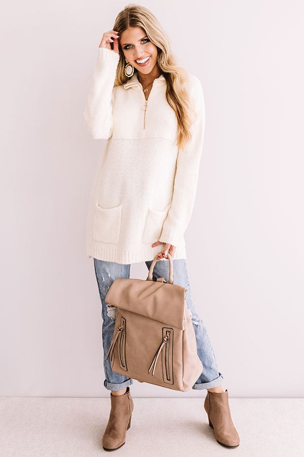 Your style will FALL into line when you wear this cream colored "Pumpkin Spicy" sweater featuring a lightweight tight knit material with a fuzzy texture, long loose sleeves, a zip up bodice with a high collared neckline, two lower accent pockets on the front, and a relaxed silhouette that falls into a straight tunic length ribbed hemline! This piece looks wonderful paired with some distressed ankle jeans, statement earrings, and a neutral wedged bootie and backpack, or with some wine colored flares, "The Lyra Snake Print Heel," and our "Say It Ain't Soho Hat in Wine!" Measurements