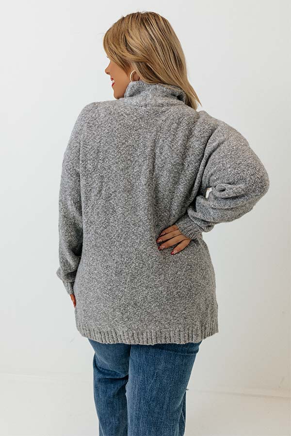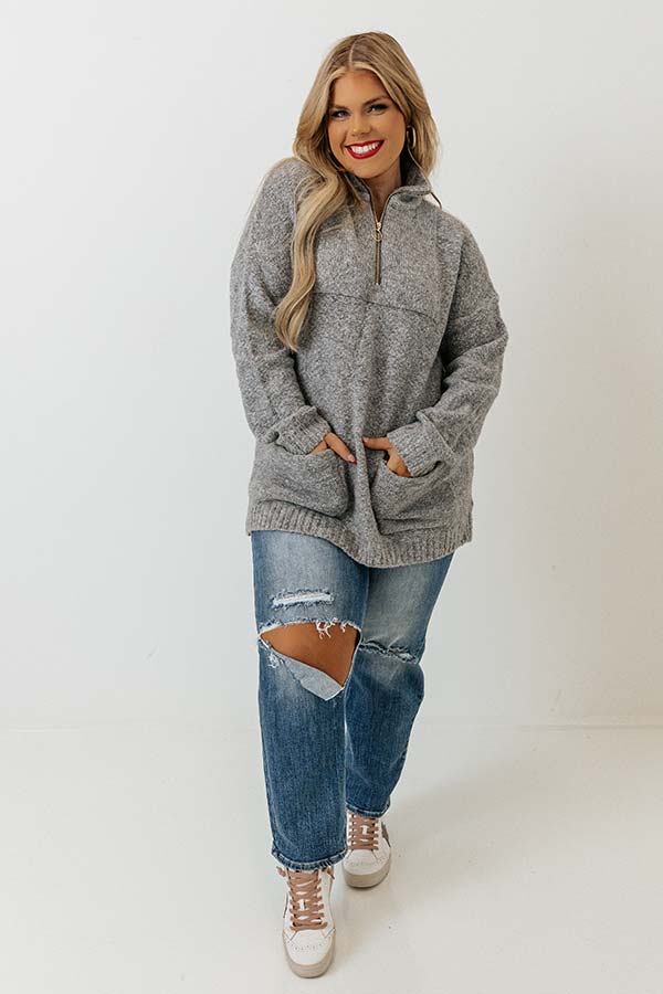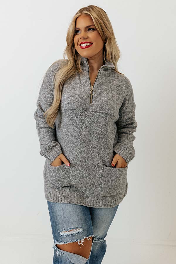 Plus Size - Your style will FALL into line when you wear this grey "Pumpkin Spicy" sweater featuring a lightweight tight knit material with a fuzzy texture, long loose sleeves, a zip up bodice with a high collared neckline, two lower accent pockets on the front, and a relaxed silhouette that falls into a straight tunic length ribbed hemline! This piece looks wonderful paired with some distressed ankle skinnies, gold hoop earrings, and a black pointed bootie and backpack, or with some wine colored flares, "The Seraphina Faux Leather Wedge in Grey," and our "Say It Ain't Soho Hat in Wine!" Measurements