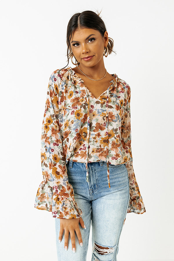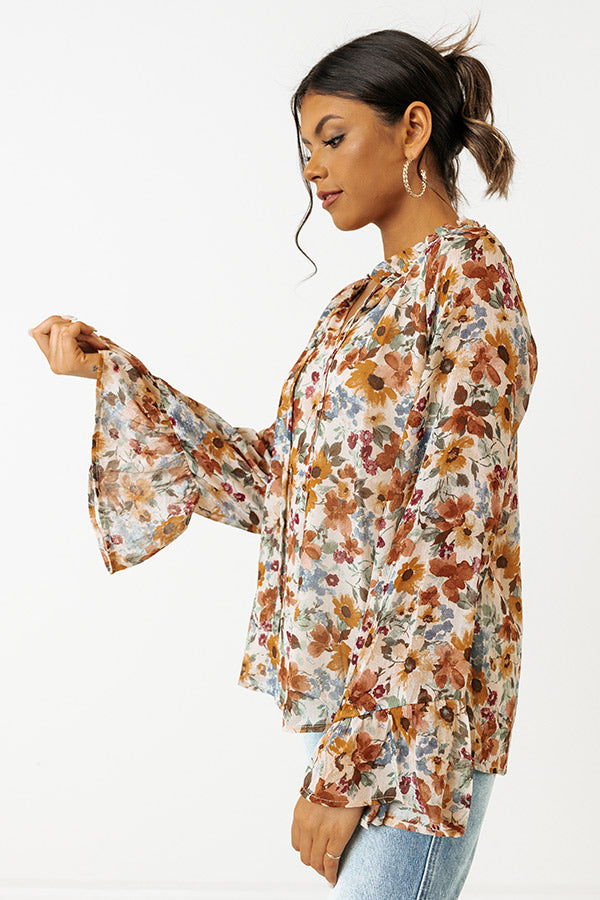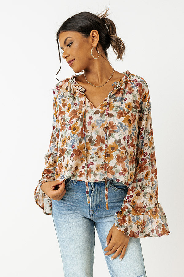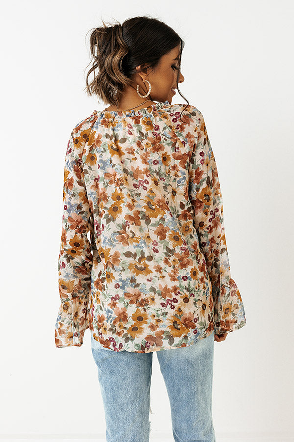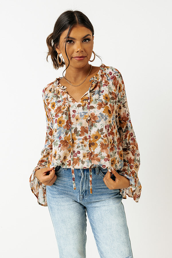 Let your style bloom with our gorgeous 'Pumpkin Swirl' shift top! Features a lightweight floral material, a v-cut neckline with a tie closure collar with subtle ruffle detailing, long loose sleeves with flowy cuffs, and a relaxed silhouette that falls into a straight hemline.