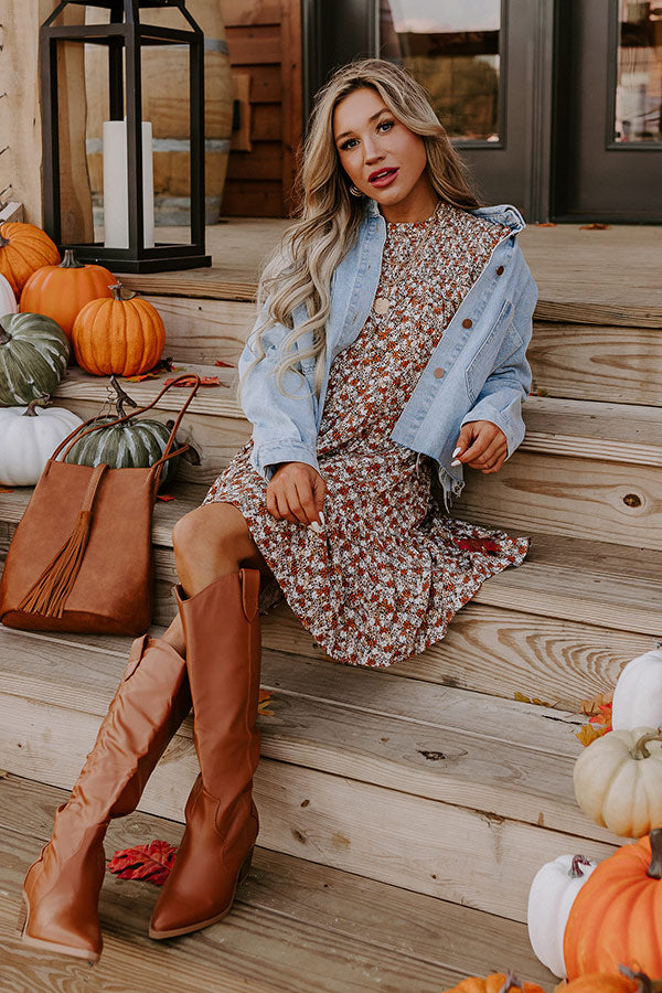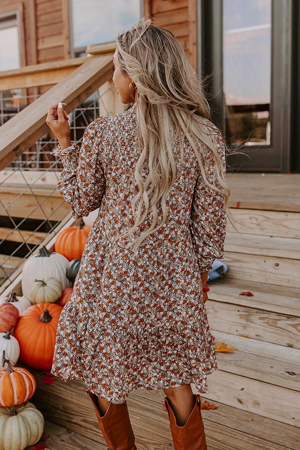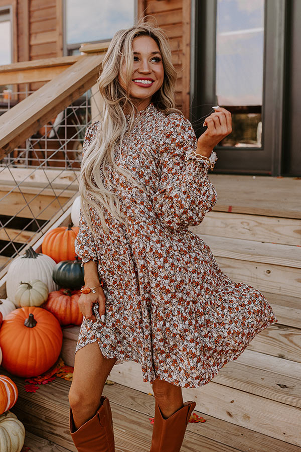You're looking so ready for all the fall things in the 'Pumpkin Swirl' shift dress! Features lightweight pumpkin, natural, white, and black hued fabric with a touch of gold, pleated high neckline, back zip closure, smocked top section, long loose sleeves, with smocked cuffs, and a flowy silhouette that falls to a mid-thigh length ruffled hemline.