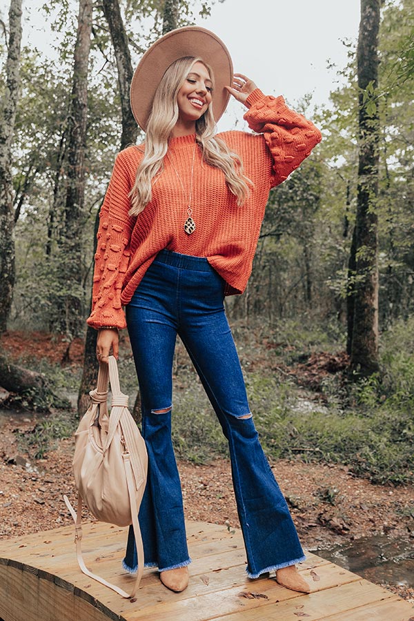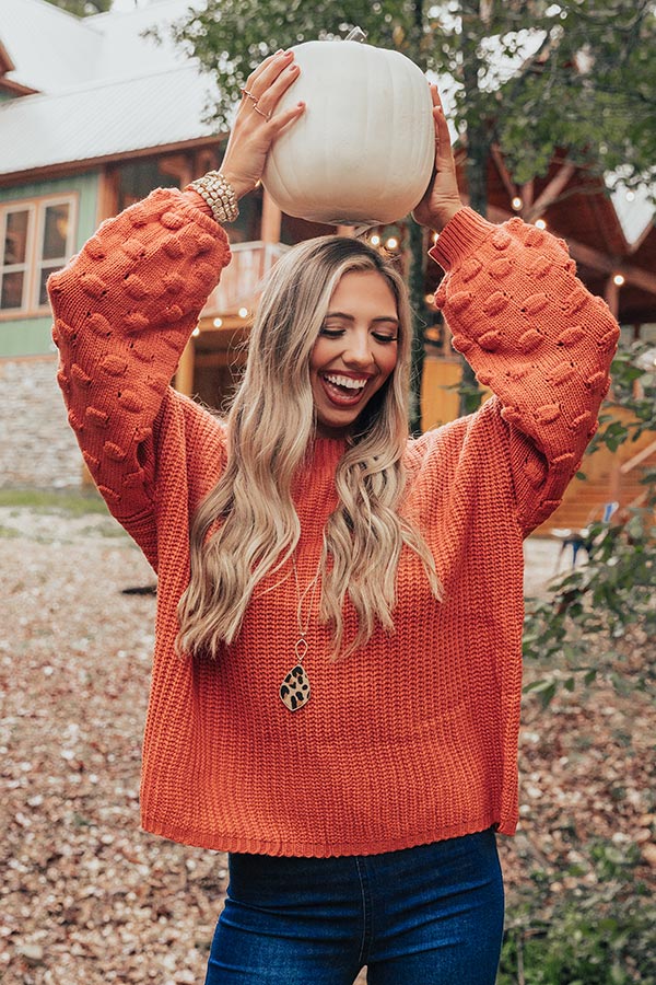 While the weather is cooling down, heat up your style with our adorable rust colored "Pumpkin Weather" sweater featuring soft and thick tight knit material with vertical ribbed texturing, a high rounded neckline, long oversized bubble sleeves with fitted cuffs and large checkered texturing on the forearms, and a relaxed silhouette that falls into a straight hemline! Measurements