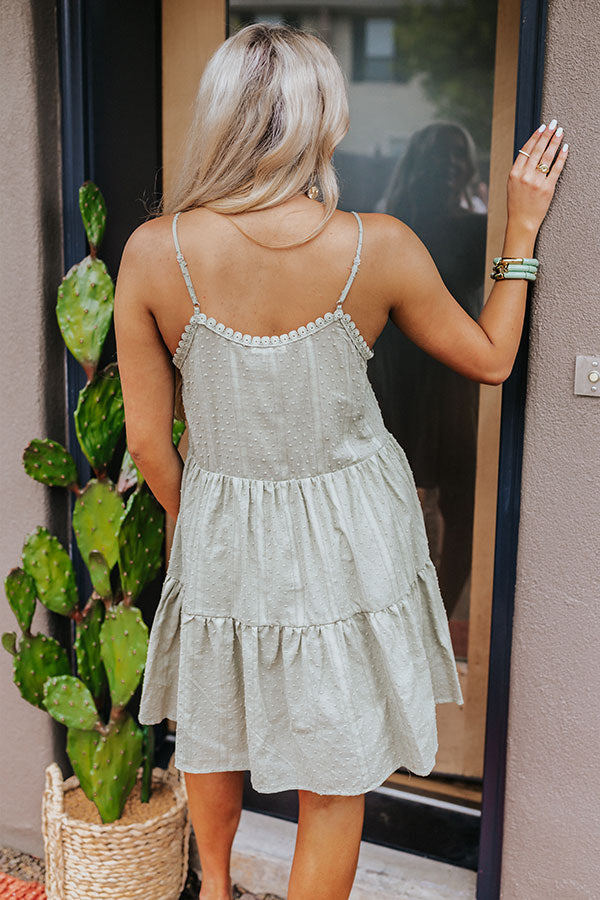 We have no doubt you will look so pretty in this charming sage hued dress featuring lightweight flowy material with subtle knit polka dot texturing, a scooped neckline with delicate trim and adjustable spaghetti straps, and a relaxed tiered silhouette that falls into a straight mid-thigh length hemline! Measurements