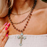 - A layered necklace featuring three different bronze chains with shimmering smoky beads