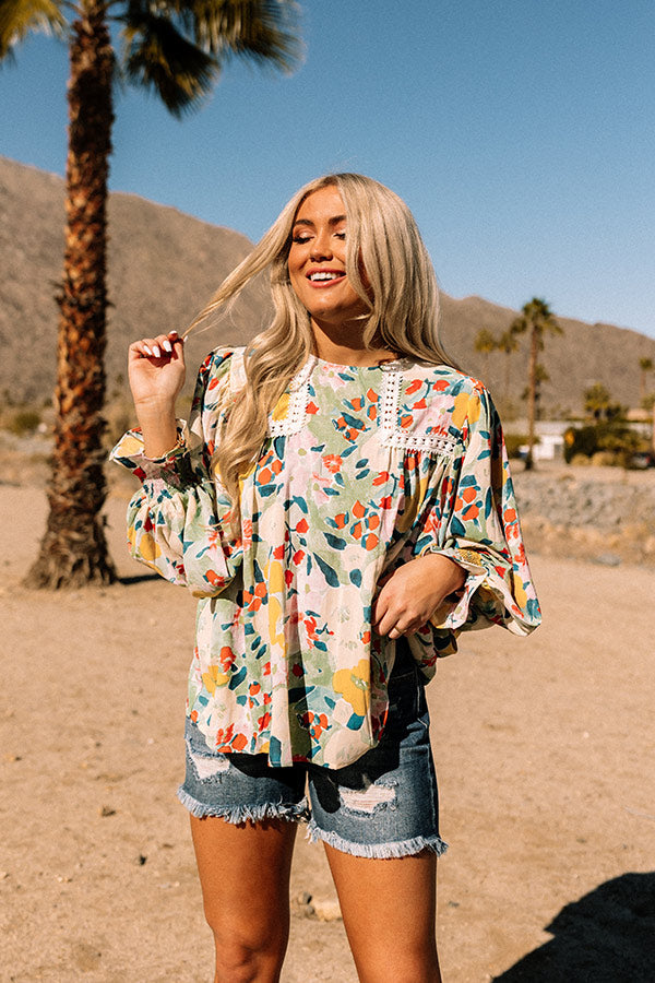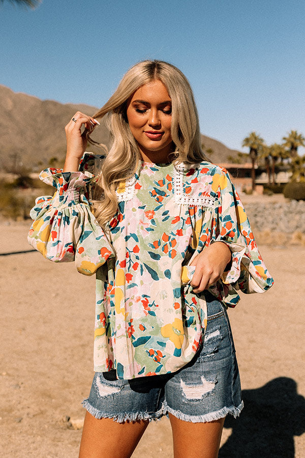 You are sure to feel nothing but pure joy when you complete your look with this gorgeous pear hued shift top featuring lightweight material patterned with a peach, coral, light yellow, and white floral print, a rounded neckline, long bishop sleeves with flared cuffs, and a relaxed silhouette that falls into a straight hemline!