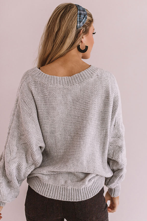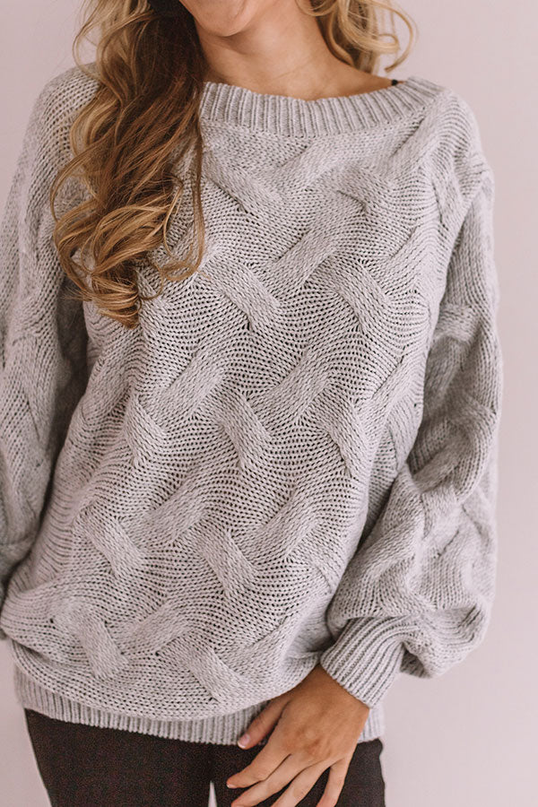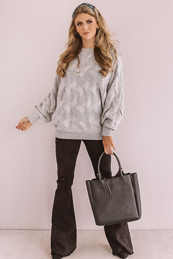 You will feel nothing but "pure love" when you wear this warm grey hued sweater featuring soft thick tight knit material with braided texturing, ribbed trim detailing, a high rounded neckline that can be worn off one shoulder, long oversized bishop sleeves with fitted cuffs, and a relaxed silhouette that falls into a straight tunic length hemline! We have styled this piece with some flares, a statement headband, and a black bootie and crossbody, but you can also wear it with some distressed ankle skinnies and "The Seraphina Faux Leather Wedge in Grey!"