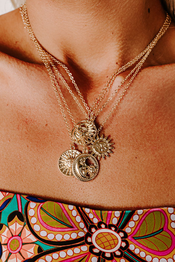 - Four separate petite gold chain necklaces for a layered look with dangling sun and moon pendants