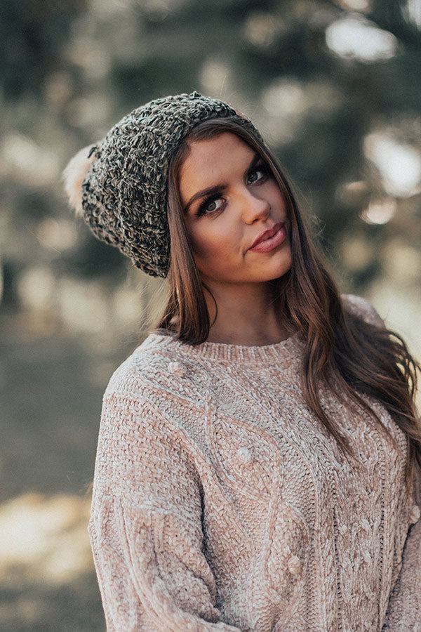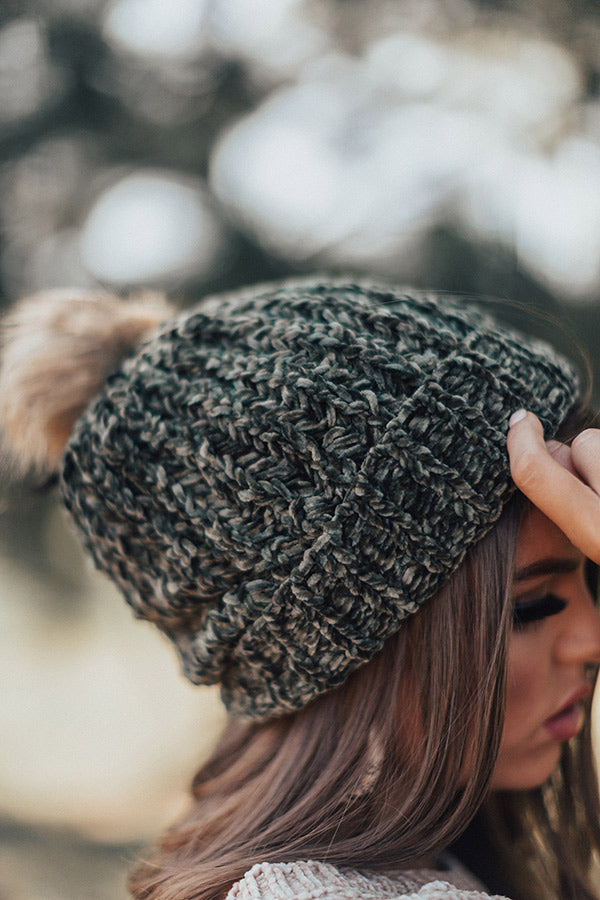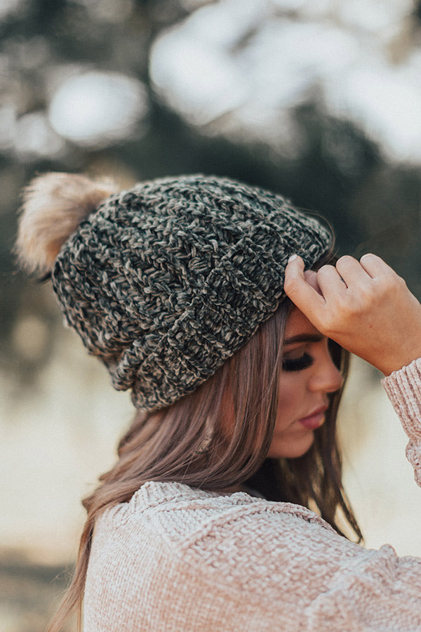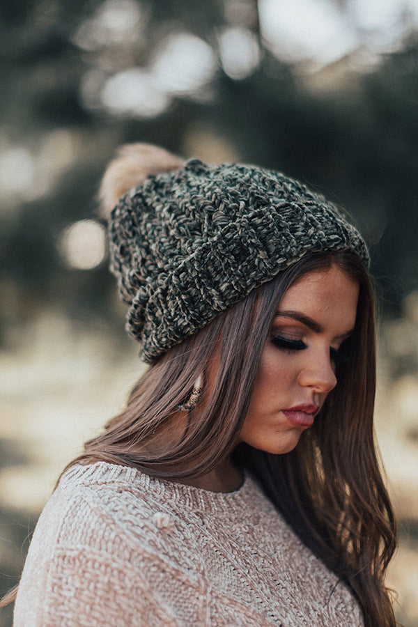 This olive colored beanie is "pure sweetness" with its soft loose knit chenille material with large texturing, fleece lining, a rolled hemline, and a faux fur pom pom accent!
