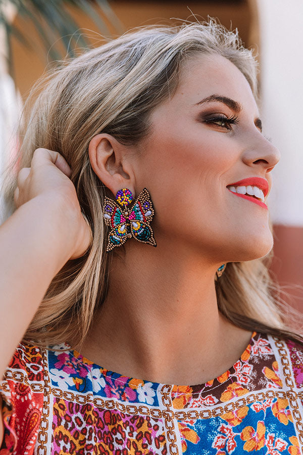 You will feel nothing but happiness when you accessorize with these adorable statement earrings featuring circle studs and dangling multi colored beaded butterflies!