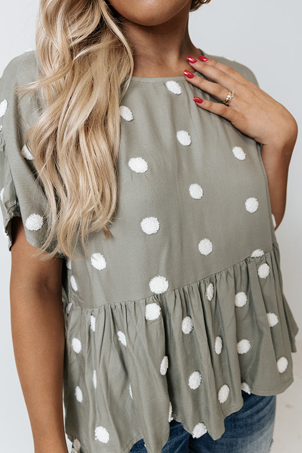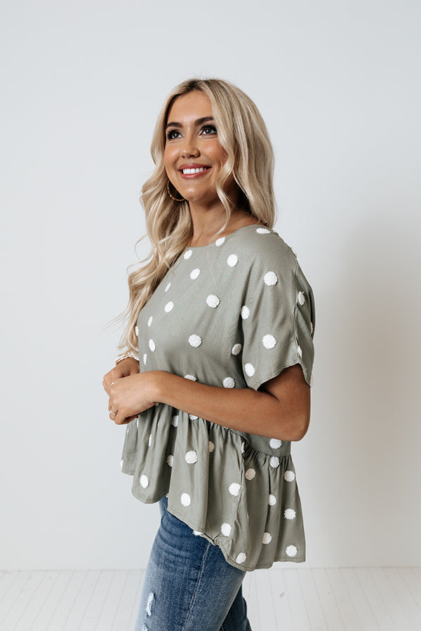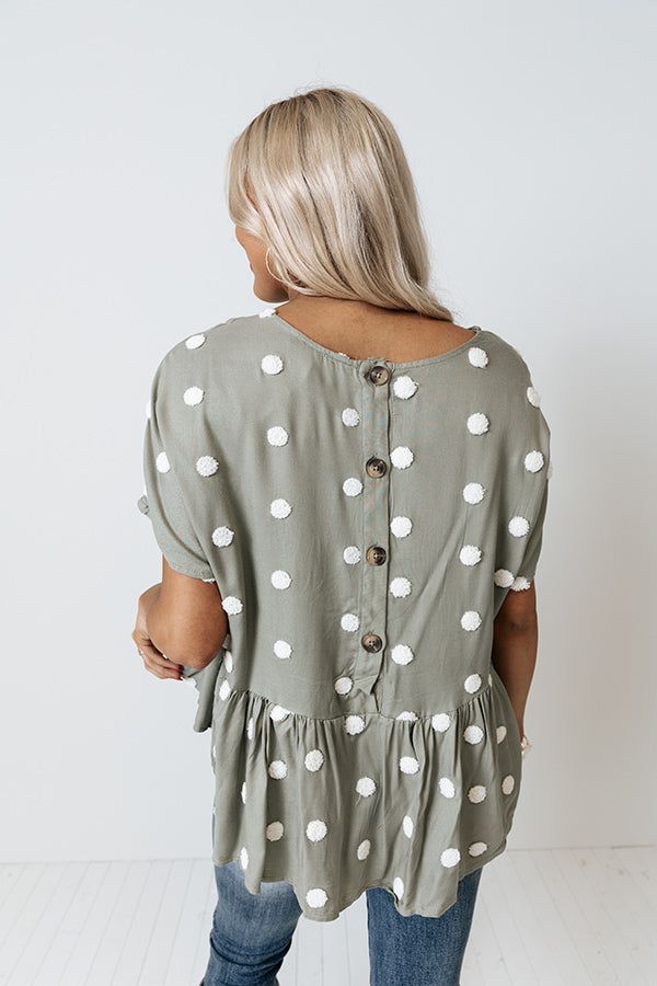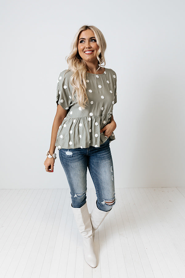 You will no longer have to be in pursuit of a top you will love when you add this pretty pear colored piece to your cart! It features lightweight material patterned with textured white polka dots, a rounded neckline, short sleeves, a four button up back, and a relaxed silhouette that falls into a peplum hemline!