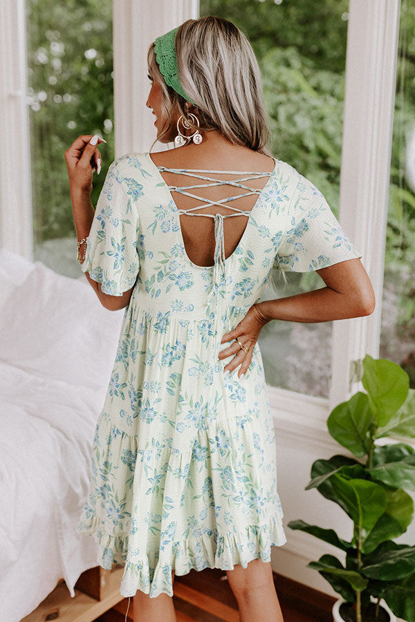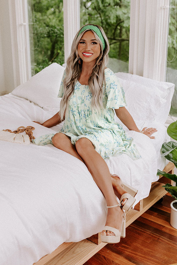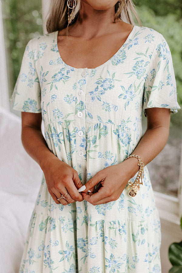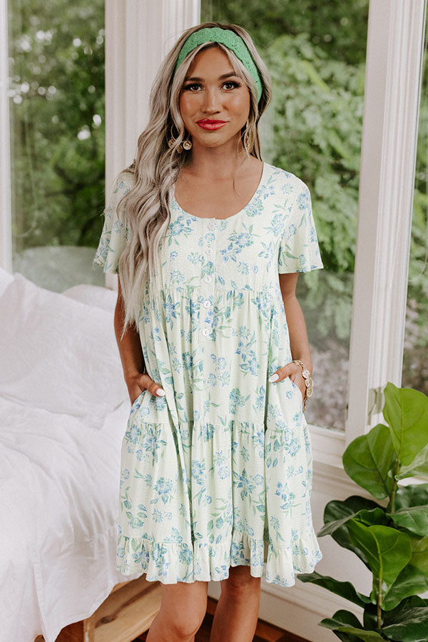 Dance to the beat of your own tune in our adorable 'Put My Song On Shift Dress' featuring lightweight material patterned with a sage colored floral print, a button up bodice with a scooped neckline, loose short sleeves, hidden side pockets, and a relaxed silhouette that falls into a ruffled mid-thigh length hemline!