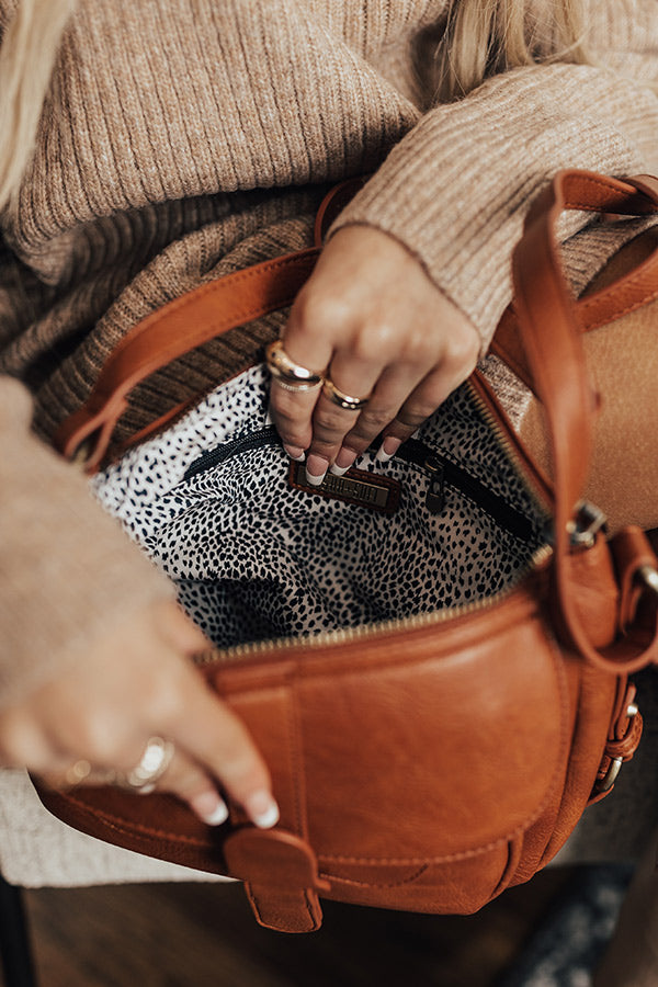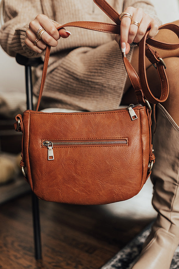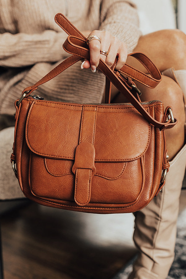 Perfect for wearing with any look, our versatile maple colored 'Put You First' crossbody features faux leather material, a front pocket with a flap closure with a snap button, an adjustable shoulder strap, a zip closure back pocket, and a spacious filly lined pouch with an zip closure and an additional zip closure pocket inside!