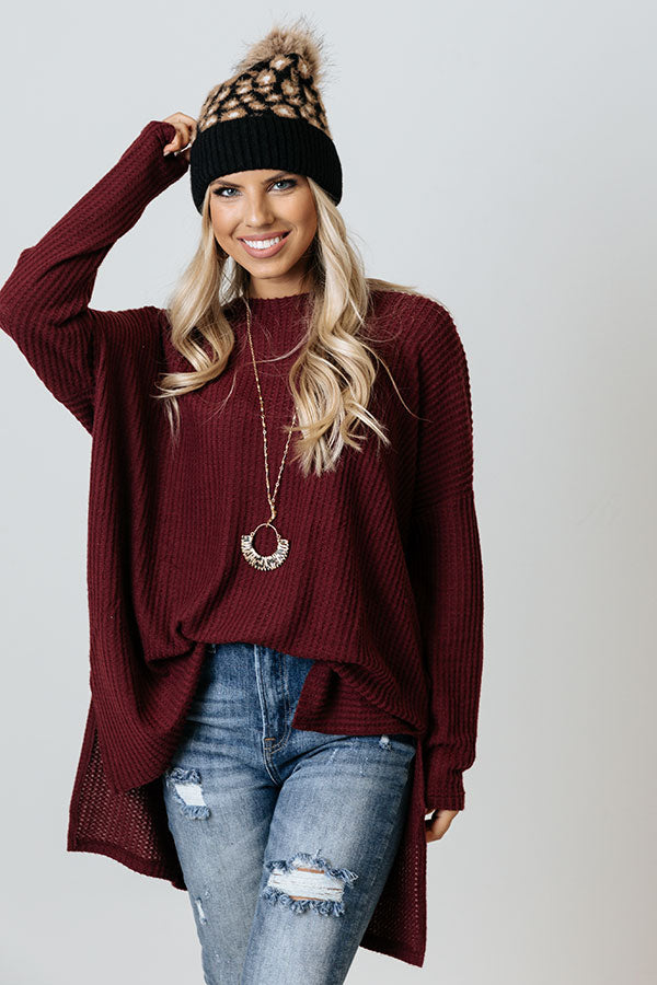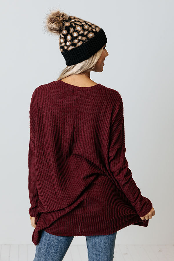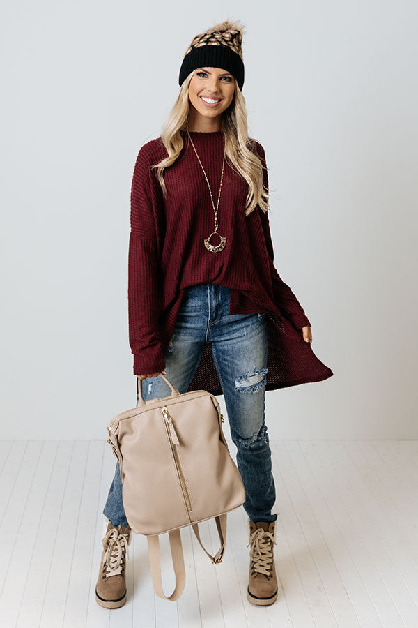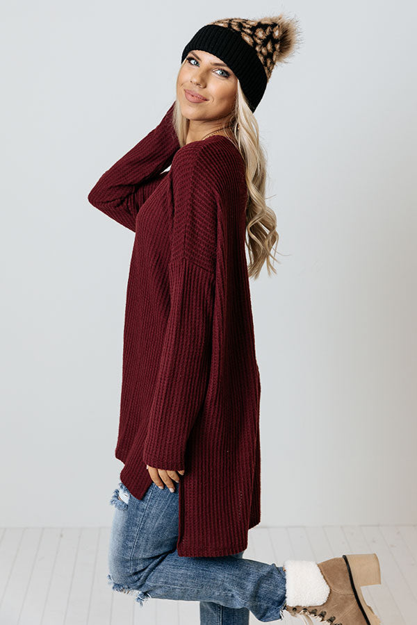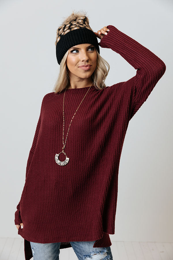 Upgrade your fall basics with our simple but stylish merlot colored 'Put You First' top featuring lightweight material with waffle knit texturing, a rounded neckline, long sleeves, and an ultra draped silhouette that falls into a straight tunic-length high/low hemline with accent side slits! Measurements