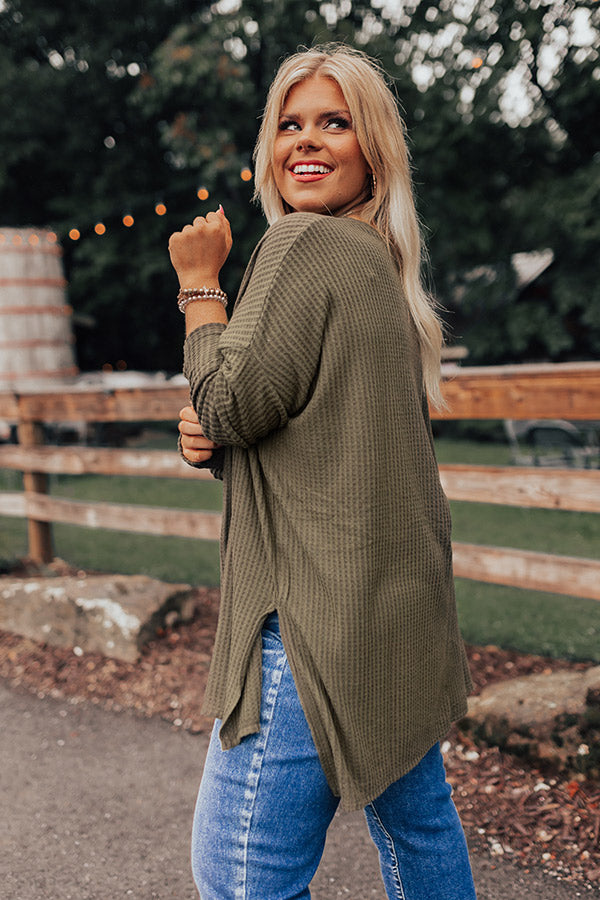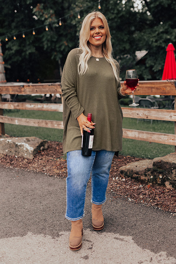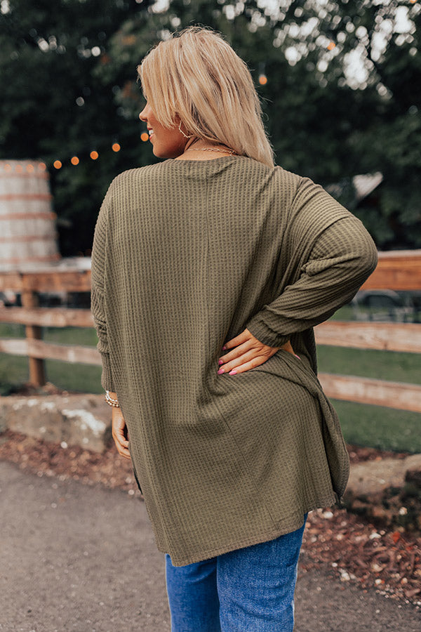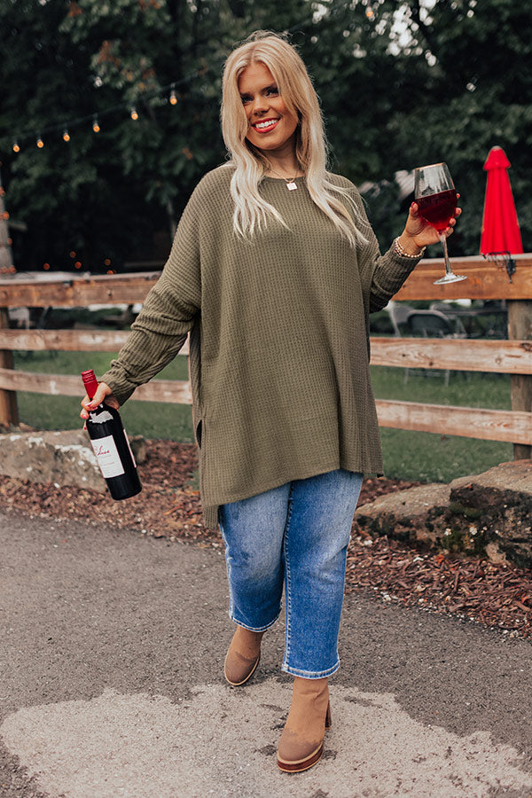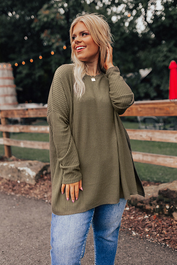 Upgrade your fall basics with our simple but stylish olive colored plus size 'Put You First' top featuring lightweight material with waffle knit texturing, a rounded neckline, long sleeves, and an ultra draped silhouette that falls into a straight tunic-length high/low hemline with accent side slits!