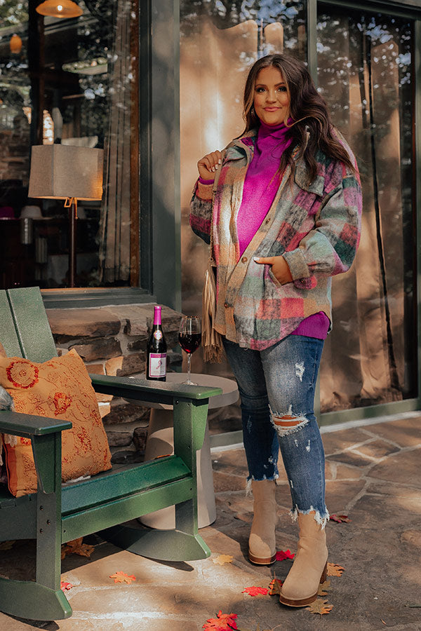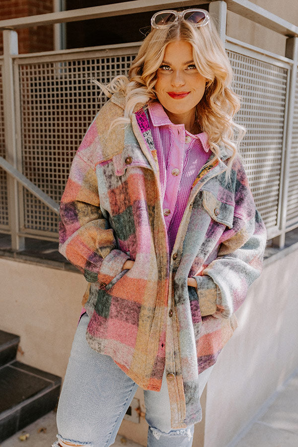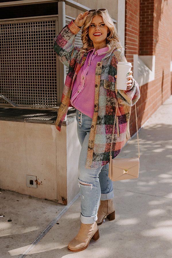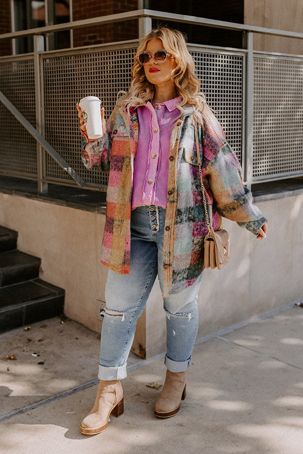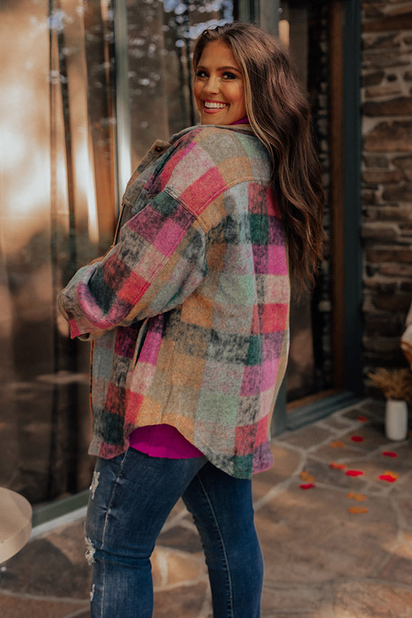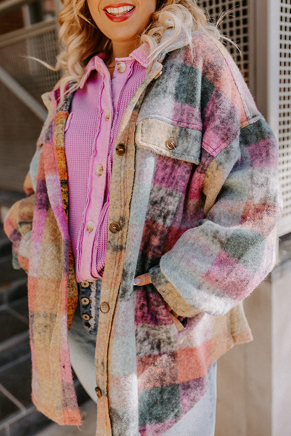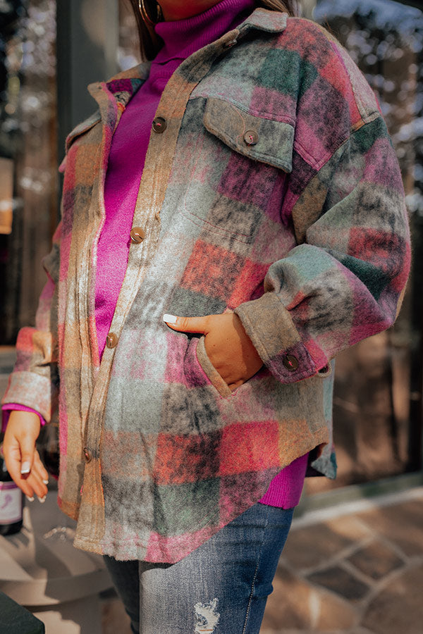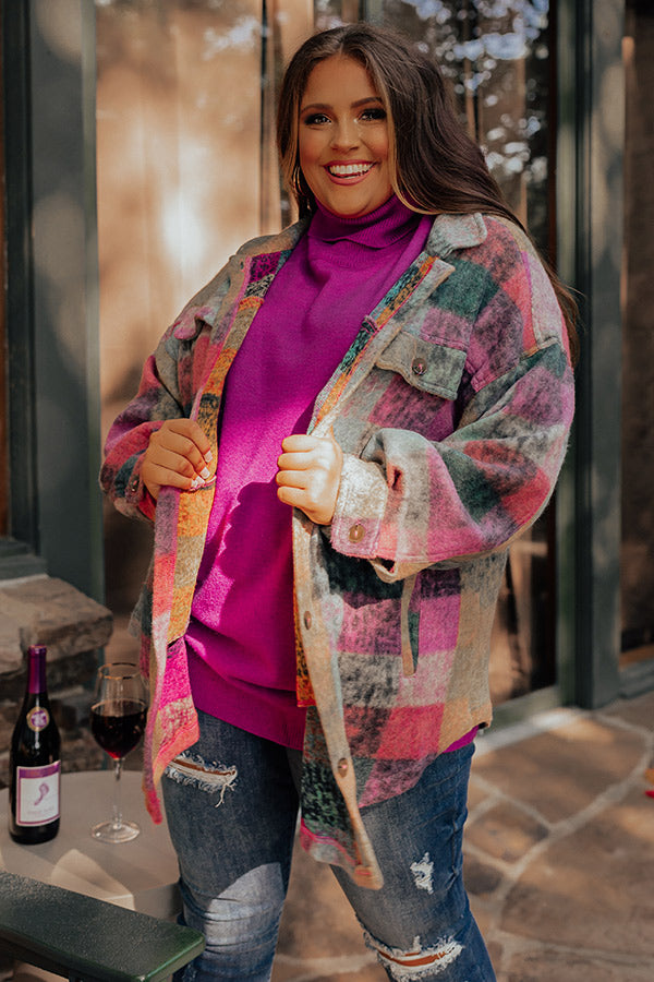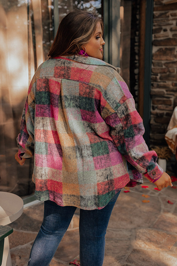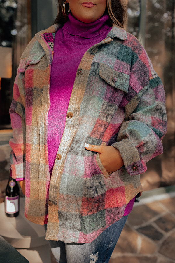 Live life colorfully in our plus size 'Quick To Cuddle Jacket' featuring soft and warm material patterned with a vibrant plaid print, a button down front with a collared neckline, long loose sleeves with button closure cuffs, hidden side pockets and two chest pockets with flap closures, and a relaxed silhouette that ends in a rounded hemline!