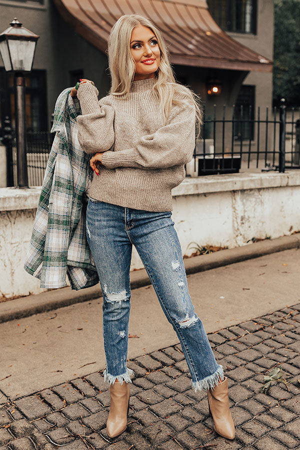 Keep warm in our adorable birch colored 'Quick trip To Brooklyn Sweater' featuring soft knit material with ribbed detailing, a high neckline, long bubble sleeves with fitted cuffs, and a slouched silhouette that falls into a straight hemline! Measurements