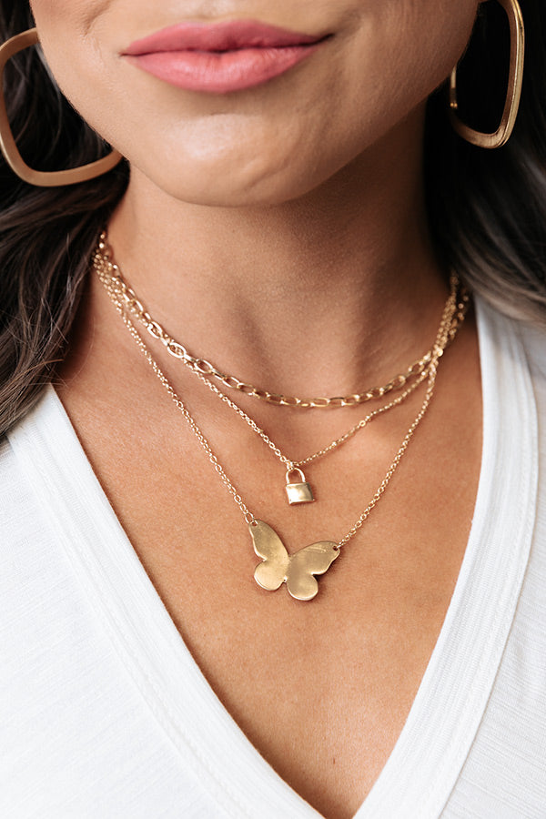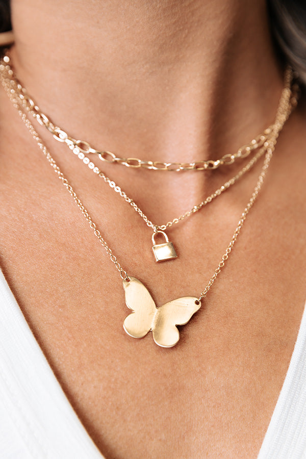 Add a dainty touch to your look with our darling 'Quiet Moments Layered Necklace' featuring three chains: a chain link choker, a middle length chain with a lock charm, and a longer chain with a butterfly pendant!