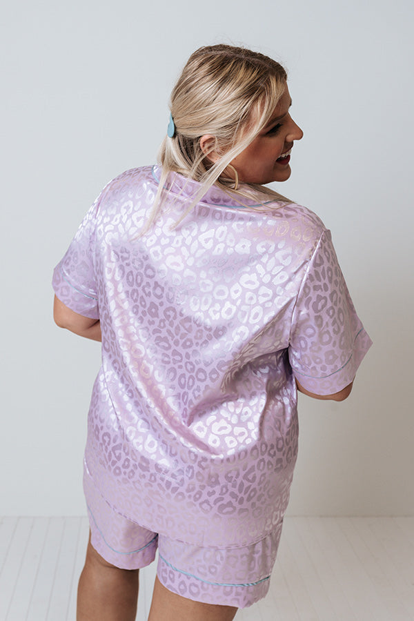 Plus Size - Enjoy the quiet moments at home in comfort with this adorable lavender top featuring lightweight satin material with a subtle leopard print, short loose sleeves, a button down front with a collared neckline, light blue accent piping, a single chest pocket, and a slouched silhouette that ends in a straight hemline!