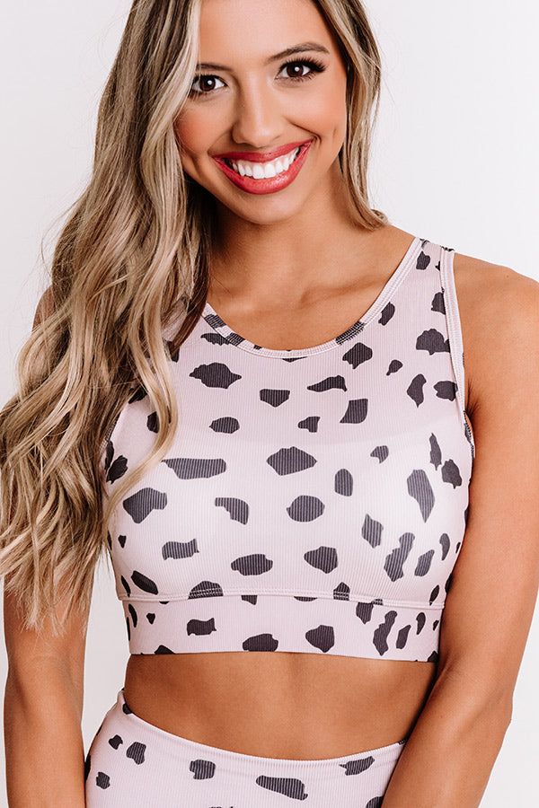You are sure to be in first place when you arrive in this darling light pink sports bra featuring lightweight four-way stretch material patterned with a bold spotted print, subtle ribbed texturing, scooped neckline, 1-inch sleeveless straps with a wide racerback fit, and a flattering form fitting silhouette that ends in a straight waistline!