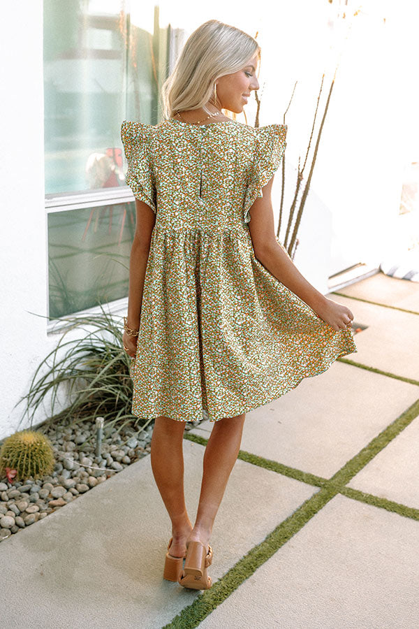 Wow the crowd in our adorable pear hued 'Rainbow Hour' dress featuring lightweight material patterned with a small blue, white, and yellow hued print, a v-cut neckline, ruffled cap sleeves, hidden side pockets, and a relaxed babydoll silhouette that falls into a straight mid-thigh length hemline!