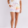 We have no doubt you will want to rush to add these adorable white shorts to your cart with their ultra soft lightweight material with horizontal pastel rainbow accent stripes, a wide elastic waistline with a tie belt, accent side pockets, and a relaxed silhouette that falls into a straight upper-thigh length hemlines! This comfy piece styles perfectly with our matching "Rainbow Rush Shift Tee," a scrunchie, and some fuzzy slippers for the ultimate two-piece lounge look!