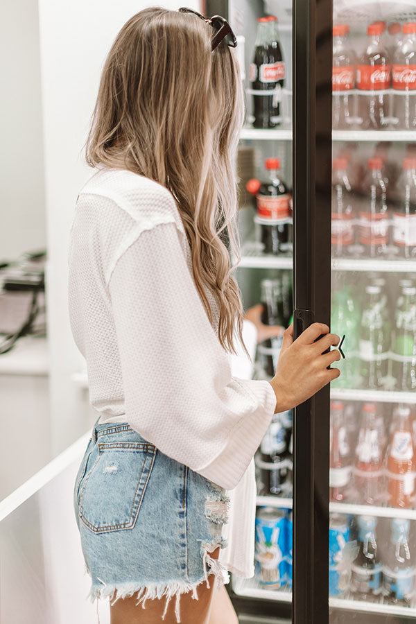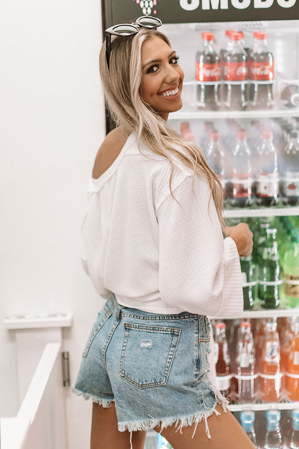 You will be "ready for Rome" when you wear this ivory top with its waffle knit texture, scooped neckline that can be worn off one shoulder, exposed seams, loose sleeves with a thick cuff, and tied hem! This transitional piece can be work with some frayed denim shorts, sunnies, and snake print espadrilles for a summer look, or with "The Henson Midrise Distressed Skinny" and "The Cassandra Snake Print Bootie" for a casual fall outfit!