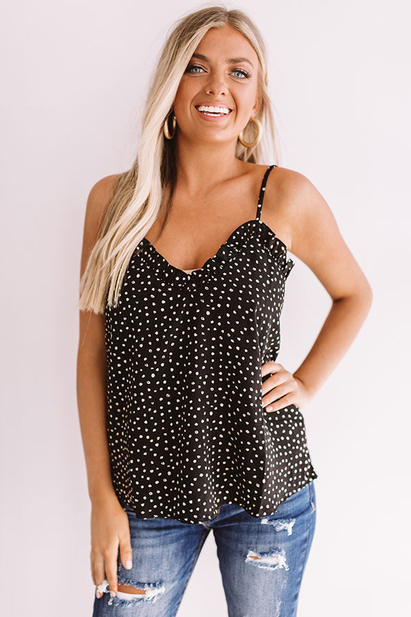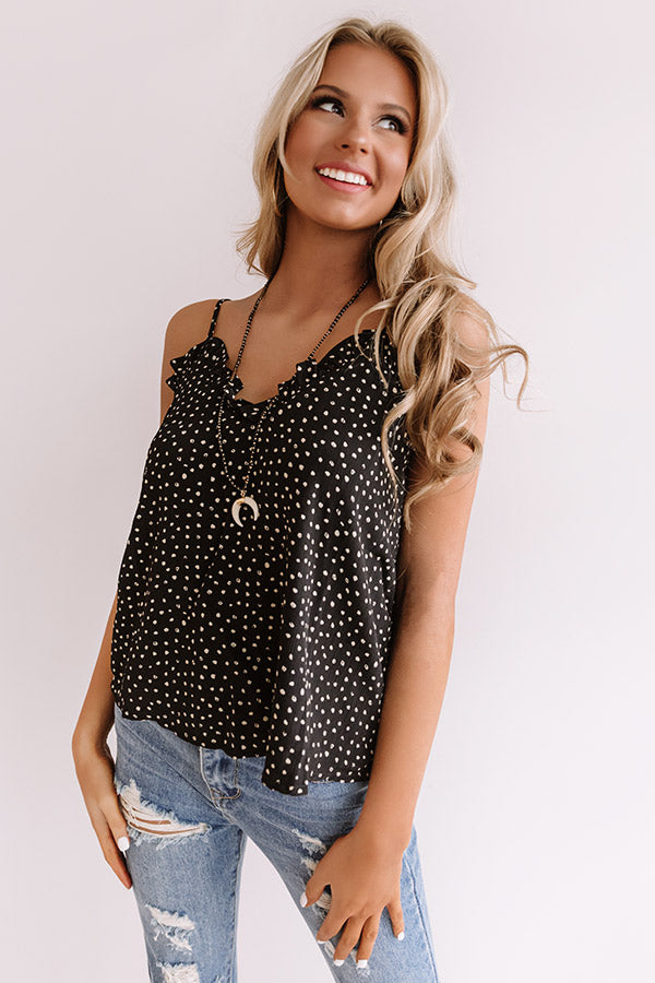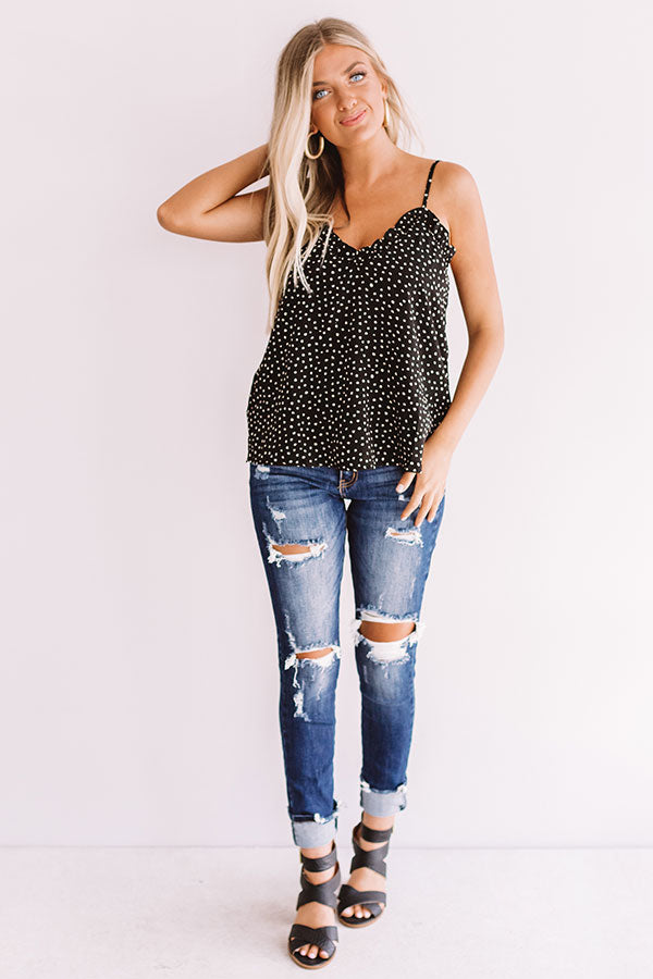 "Ready or dot"...we're taking the basic tank to the next level with this black shift tank featuring a lightweight material patterned with black polka dots, a ruffled v-cut neckline, adjustable spaghetti straps, and a relaxed silhouette that falls into a straight hemline! This piece will be an adorable addition to any summer closet when you style it with some distressed black or denim skinnies and a cutout wedge or simple heel, but for a more bold look, you can pair this basic with some distressed denim shorts and pops of color like our "Mia Faux Suede Lace Up Heel in Red" and our "Bryant Park Views Quilted Crossbody in Red!" Measurements