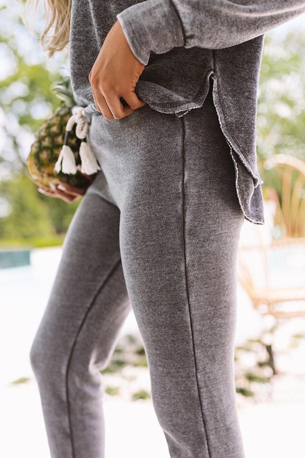There is no better piece to wear on a summer road trip than these casual cute charcoal colored joggers featuring soft lightweight material, an elastic waistband with a tie belt closure, and a relaxed pants silhouette that falls into fitted ankle length hemlines! This comfy piece styles perfectly with our matching "Ready, Set, Road Trip Sweatshirt in Charcoal," a baseball cap, and some trendy sneakers for the ultimate two-piece lounge look! Measurements