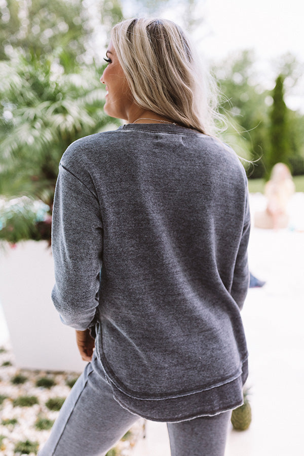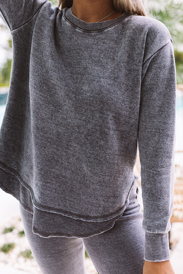 There is no better piece to wear on a summer road trip than this casual cute charcoal colored sweatshirt featuring soft lightweight material, a high rounded neckline, long loose sleeves with fitted cuffs, and a relaxed silhouette that falls into a rounded layered hemline with accent side notches! This comfy piece styles perfectly with our matching "Ready, Set, Road Trip Joggers in Charcoal," a baseball cap, and some trendy sneakers for the ultimate two-piece lounge look! Measurements