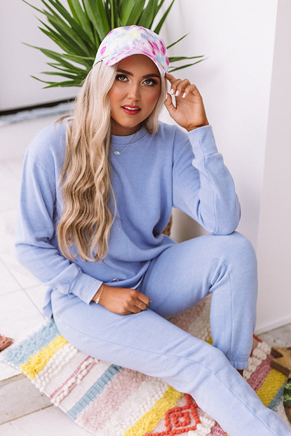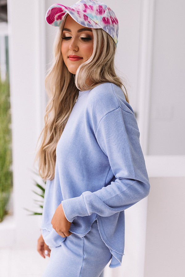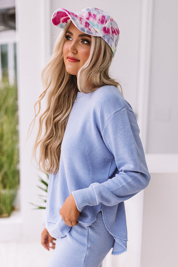 There is no better piece to wear on a summer road trip than this casual cute periwinkle colored sweatshirt featuring soft lightweight material, a high rounded neckline, long loose sleeves with fitted cuffs, and a relaxed silhouette that falls into a rounded layered hemline with accent side notches! This comfy piece styles perfectly with our matching "Ready, Set, Road Trip Joggers in Periwinkle," a tie dye baseball cap, and some trendy sneakers for the ultimate two-piece lounge look! Measurements