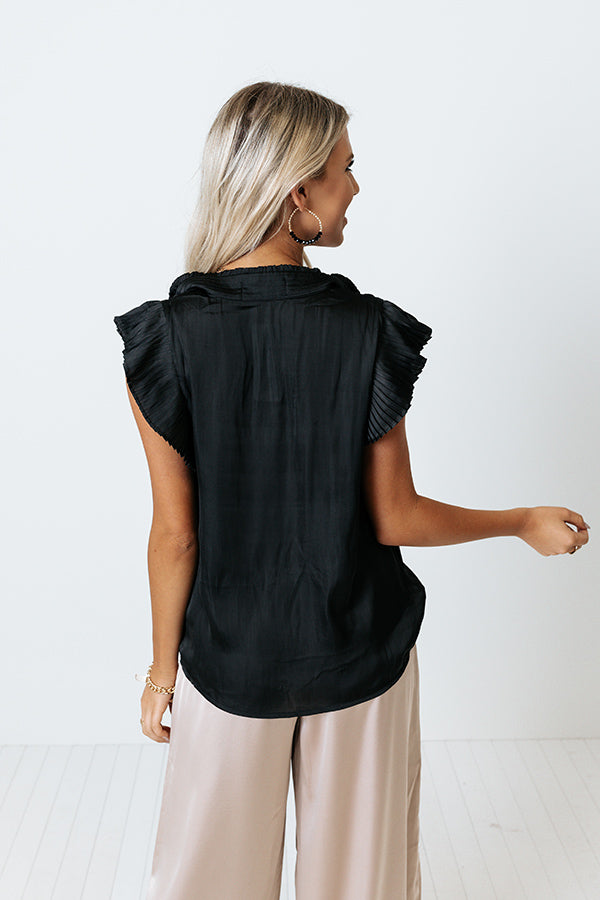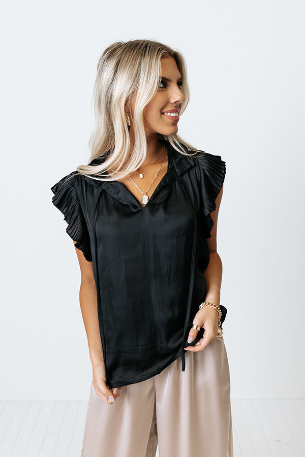 You will look like you are ready to achieve great things when you wear this chic black shift top featuring sleek lightweight satin-like material, a tie closure v-cut neckline, ruffled cap sleeves, and a relaxed silhouette that falls into a straight hemline! Measurements