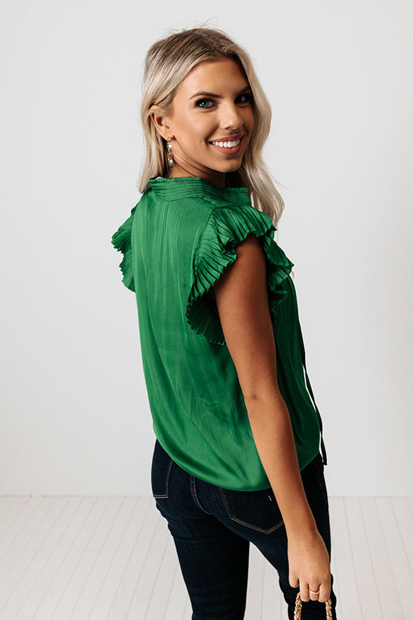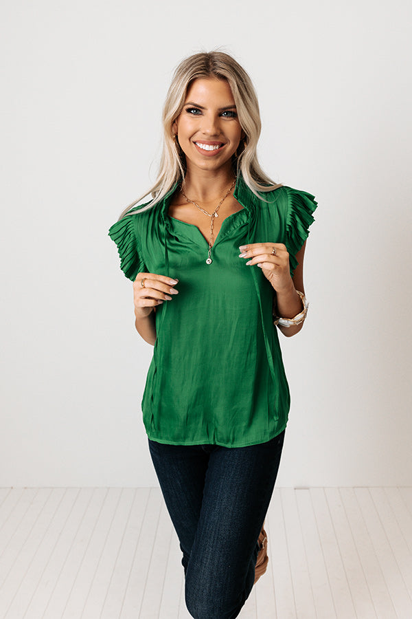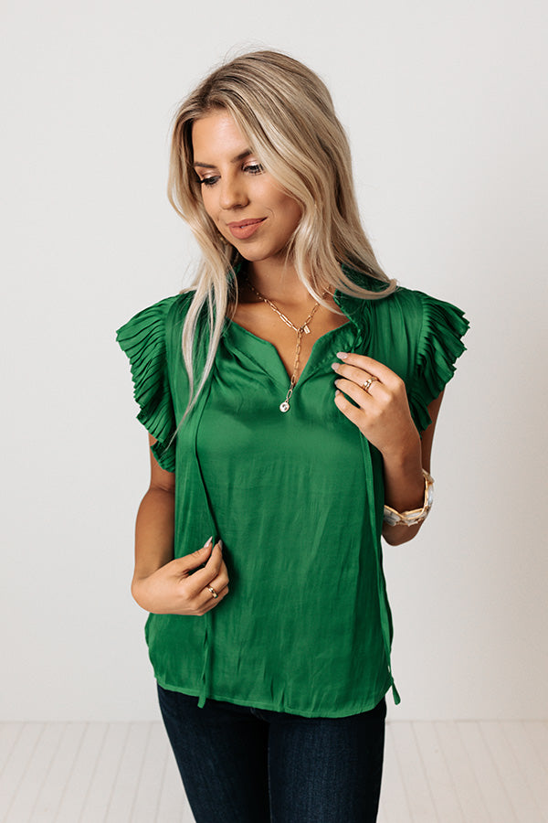 You will look like you are ready to achieve great things when you wear this chic green shift top featuring sleek lightweight satin-like material, a tie closure v-cut neckline, ruffled cap sleeves, and a relaxed silhouette that falls into a straight hemline! Measurements