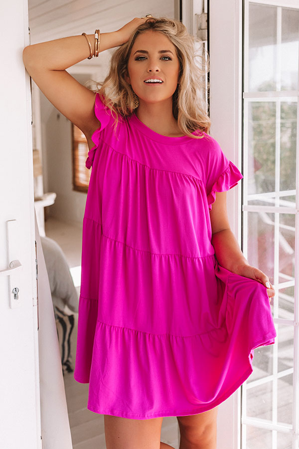 You will be "ready to party" when you put on this flirty hot pink dress featuring lightweight material, a high rounded neckline, short loose sleeves with large ruffled trim, and an ultra relaxed tiered babydoll silhouette that falls into an uneven mid-thigh length hemline! We have styled this elegant transitional piece with a cheetah print wedge, but you can also wear it layered under a distressed denim jacket with "The Seraphina Faux Leather Wedge in Grey," our "All Caught Up Headband in Grey," and our "Spanish Coast Fringe Crossbody in Grey!" Measurements