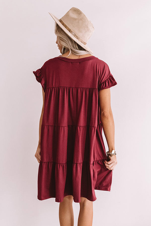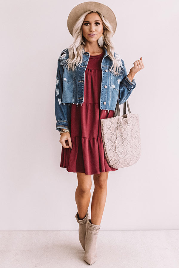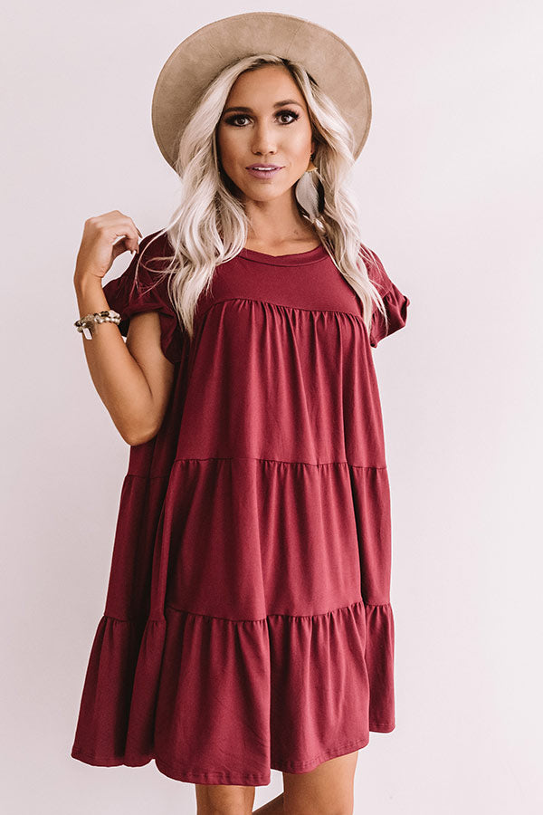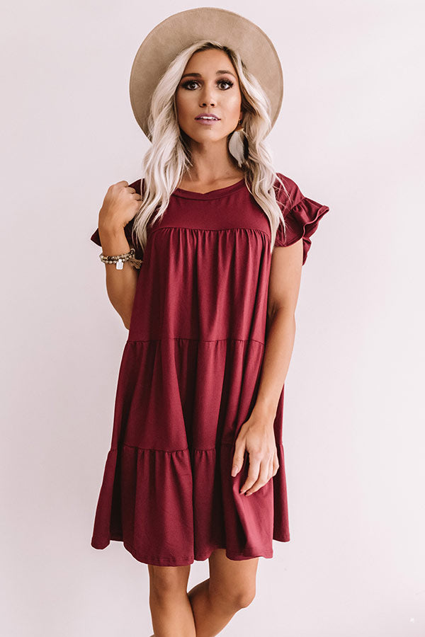 You will be "ready to party" when you put on this flirty merlot colored number featuring lightweight material, a high rounded neckline, short loose sleeves with large ruffled trim, and an ultra relaxed tiered babydoll silhouette that falls into an uneven mid-thigh length hemline! We have styled this elegant transitional dress under a distressed denim jacket with a snake print tote and a neutral bootie and faux suede hat, but you can also wear it with "The Jess Faux Suede Heel in Grey" and our "All Caught Up Headband in Grey!" Measurements