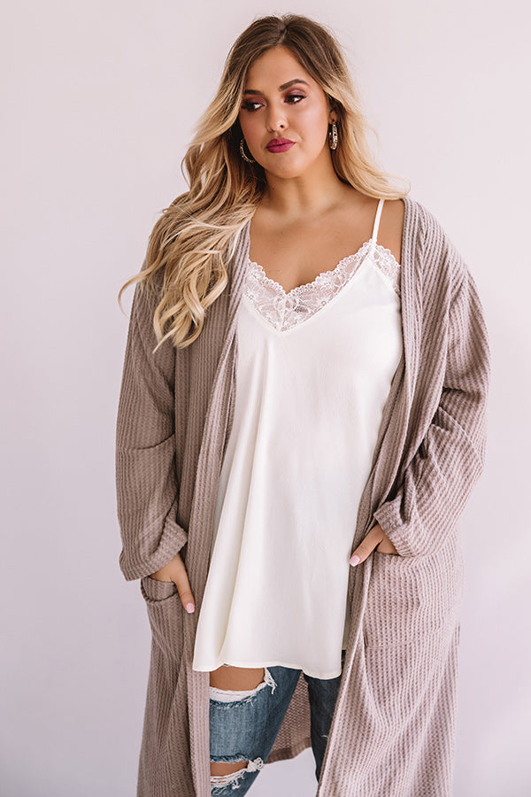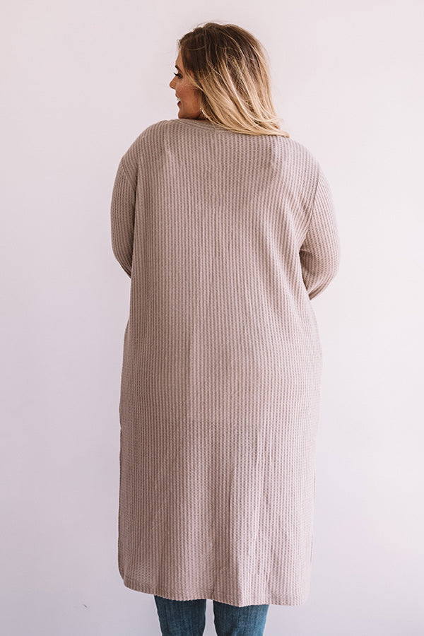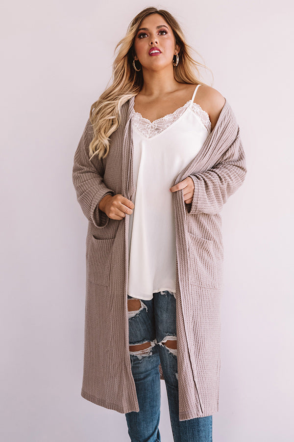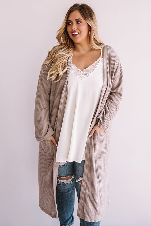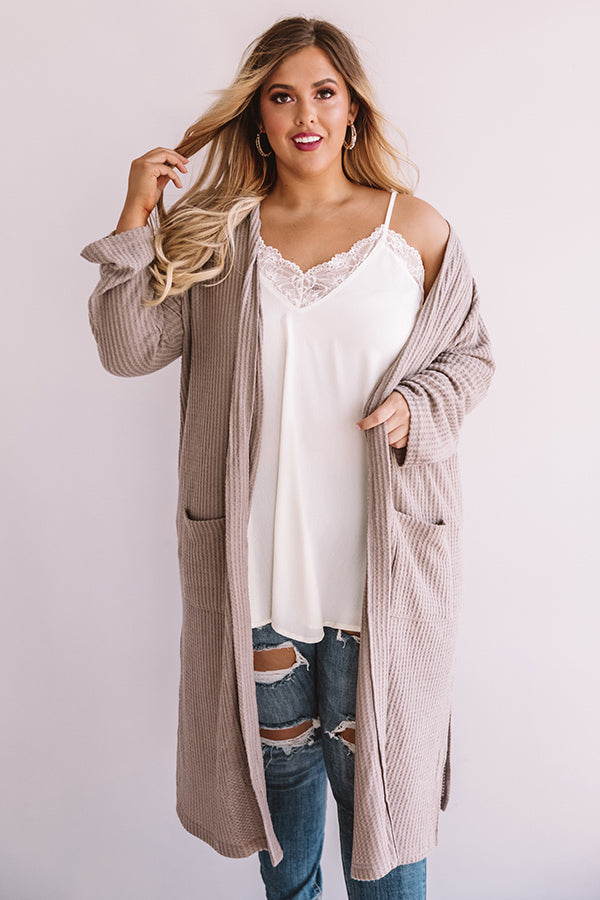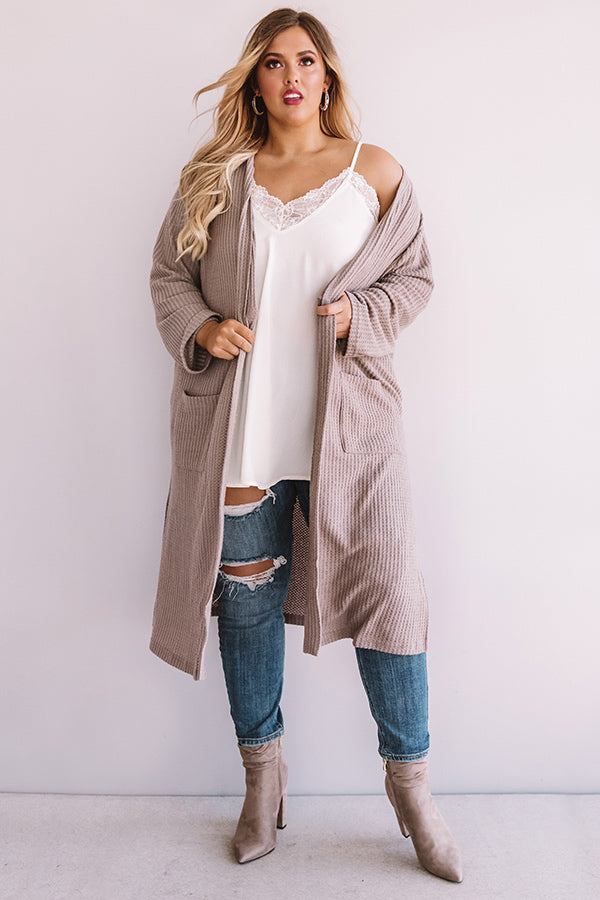 Ready To Rendezvous Waffle Knit Cardigan In Taupe Curves