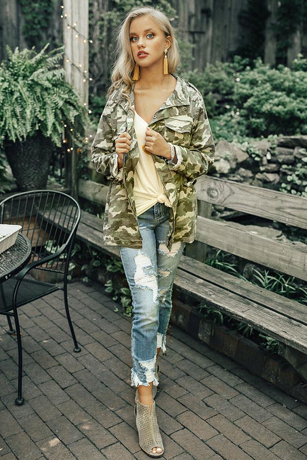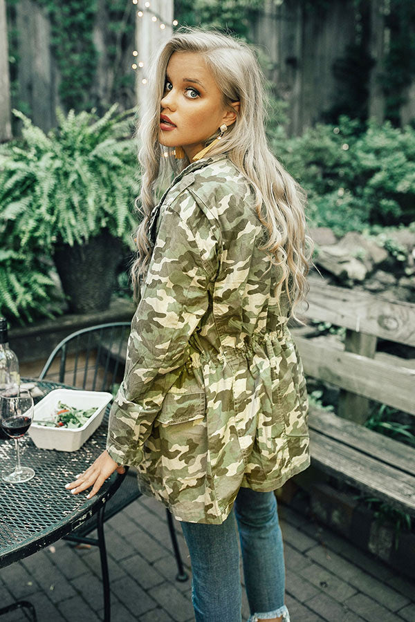 Cool & casual style comes effortlessly with this classic camo jacket! The "Ready To Rock Camo Jacket" features front & side flap pockets, a drawstring waistline (that allows you to create the most flattering fit for you), & front snap + zip closure. Layer this cute camo jacket over any of your favorite basics for a stylish look that is ready to take on the great outdoors... Or the nearest happy hour!