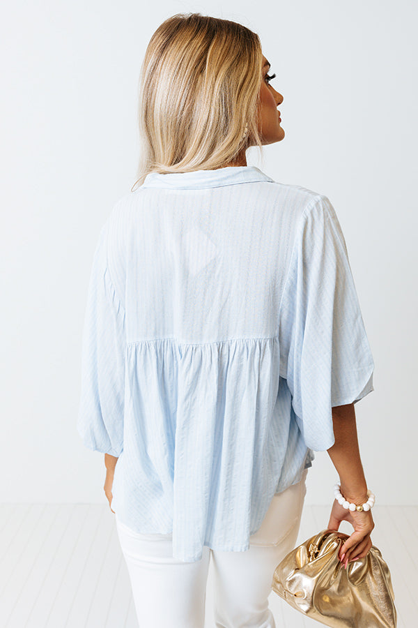 You are sure to receive endless compliments when you complete your look with our cute sky blue 'Ready To Scroll' top featuring lightweight material, a button up front with a collared v-cut neckline, oversized half sleeves, and a relaxed babydoll silhouette that falls into a straight hemline!