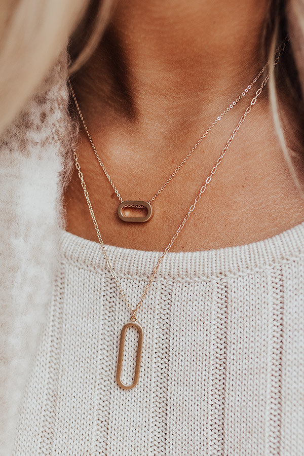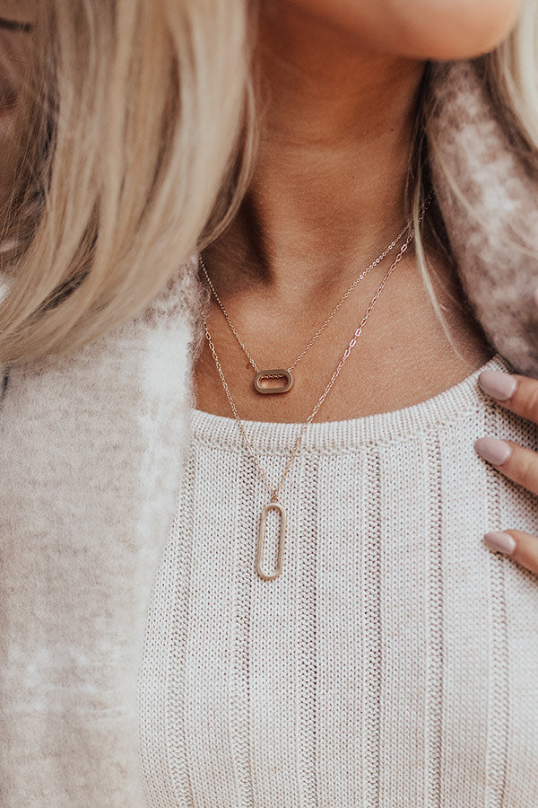 We have no doubt you will love to accessorize with our darling gold 'Ready To Wine Down Necklace' featuring a dainty short chain with a horizontal oval hoop charm and a longer dainty chain with a vertical elongated oval charm!