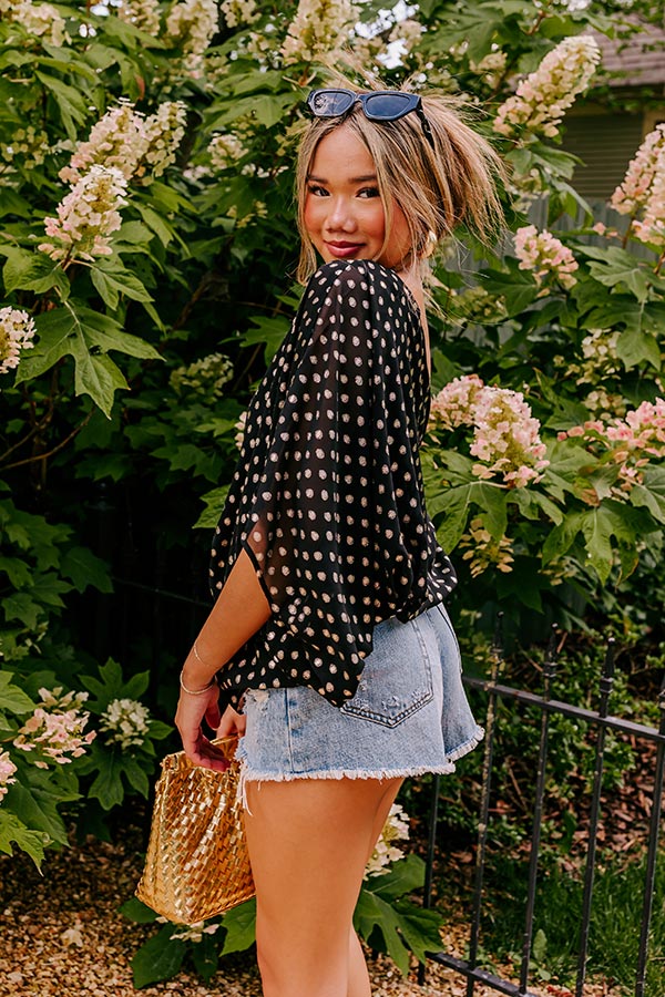 Add a fun pattern to your holiday wardrobe with our flirty black 'Ready To Wine Down' top featuring lightweight flowy material patterned with gold polka dots, a diagonal neckline and upper back with a single bat wing short sleeve, and an ultra draped silhouette that falls into an elastic hemline!